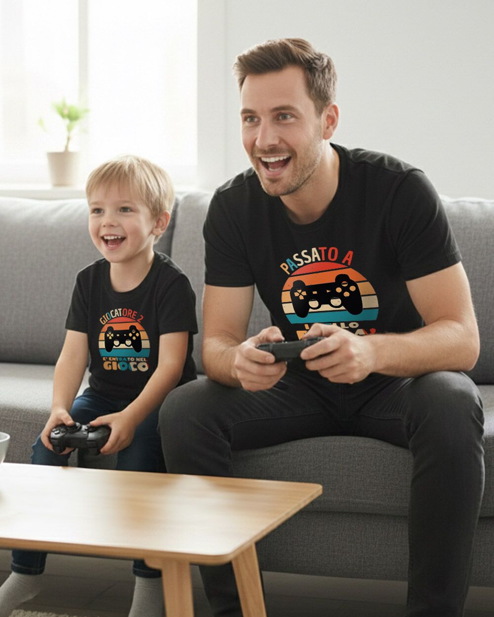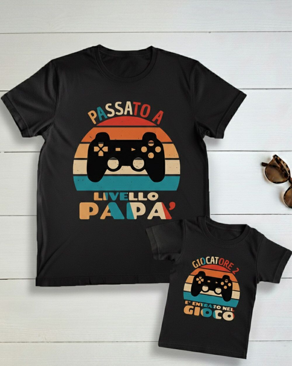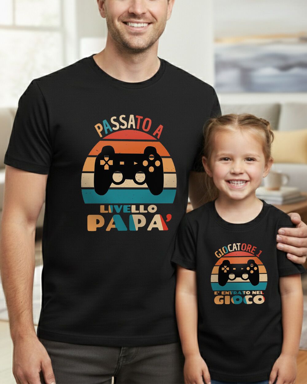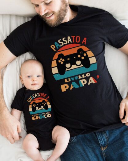 - Grafica simpatica per i papà amanti dei videogiochi: Il design divertente riprende lo stile dei classici videogames, con la scritta “Passato a livello Papà” sulla maglietta del papà e “Giocatore è entrato nel gioco”.