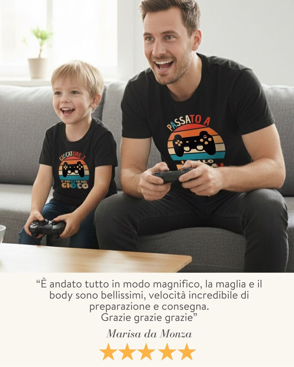Questo set coordinato papà figlio a tema videogioco è la sorpresa perfetta per celebrare l’avventura più grande della vita: la paternità. Immagina i sorrisi complici e gli occhi lucidi quando si indosseranno queste morbide magliette abbinate, creando subito un ricordo bellissimo da fotografare. Una vera e propria coccola di tessuto che trasforma il gioco di squadra tra papà e bambino in un’emozione pura e quotidiana, tutta da vivere insieme.