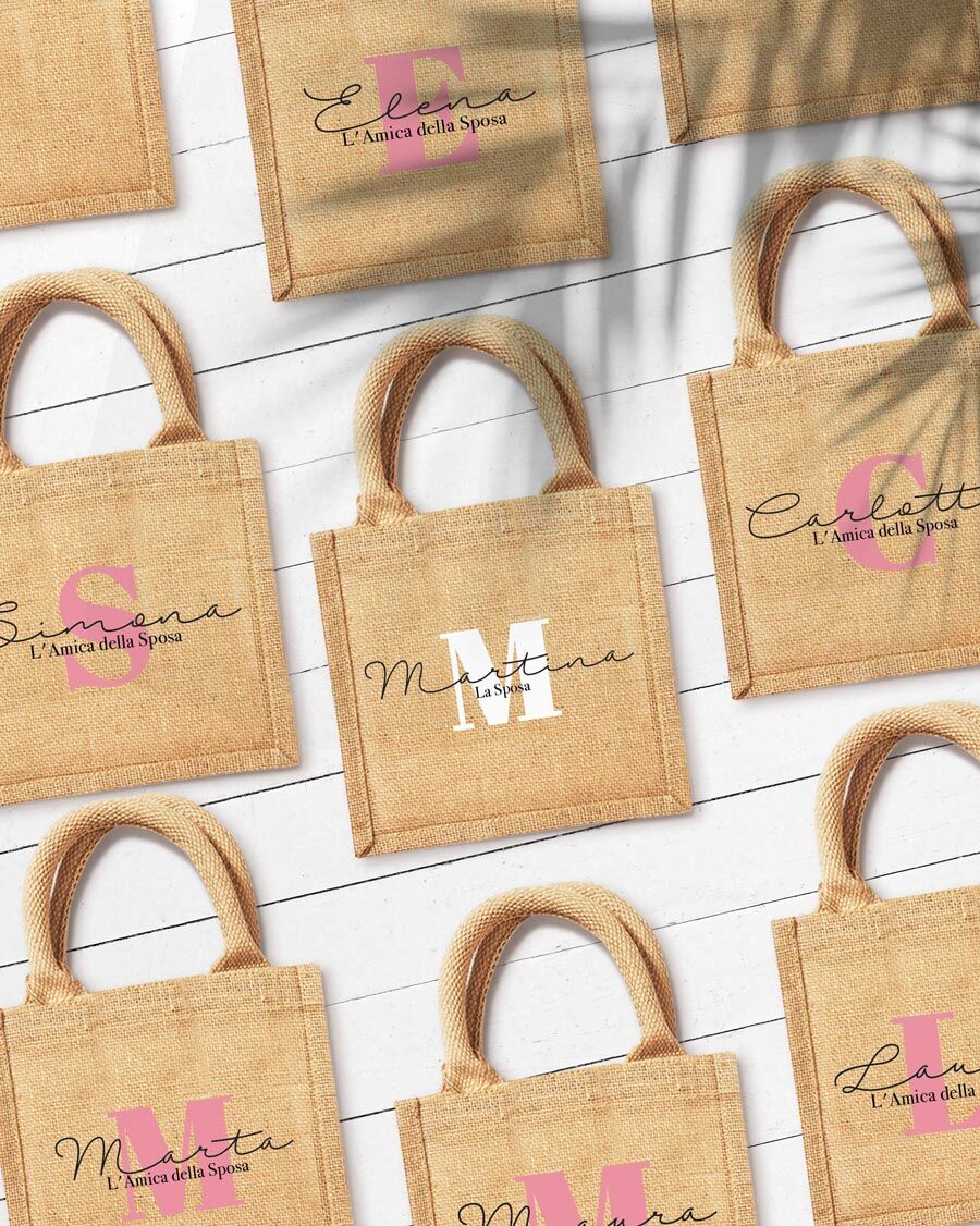 Personalizzazione del nome in colore nero. L’iniziale sarà in color bianco per la borsa della sposa e in color rosa per le borse delle amiche della sposa.