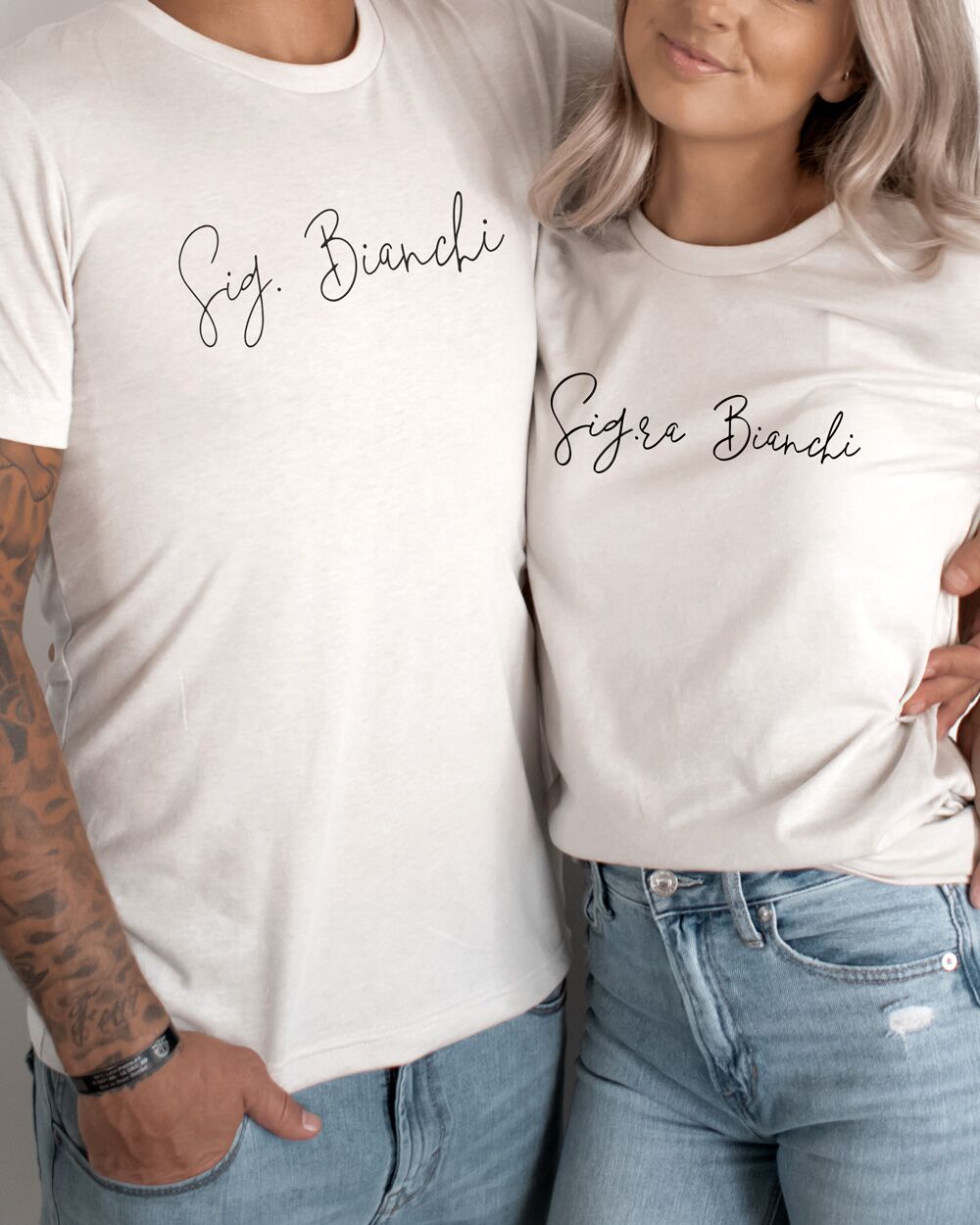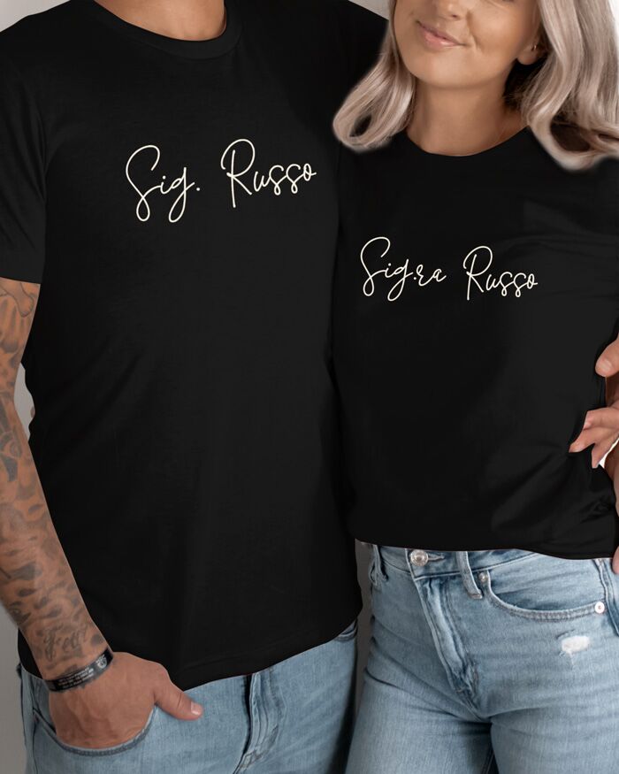 Set coordinato di t-shirt “Sig. e Sig.ra” personalizzabili con il vostro nome e l’anno in cui vi siete fidanzati.