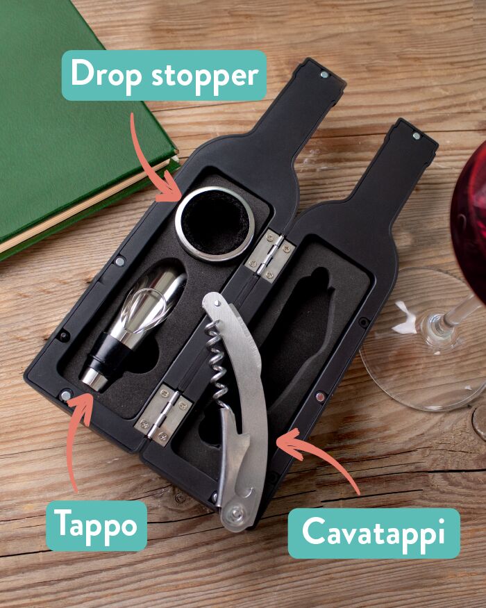 - UN KIT DA SOMMELIER CON TUTTO IL NECESSARIO: Questa box presenta tutti gli accessori indispensabili per un’esperienza degustativa eccellente: un cavatappi tascabile, perfetto per aprire in modo delicato la bottiglia di vino più pregiata senza rovinarla, un anello salvagoccia classico, per prevenire sgradite macchie durante la mescita del vino ed infine un tappo per prevenire l’ossidazione del vino rimasto nella bottiglia.