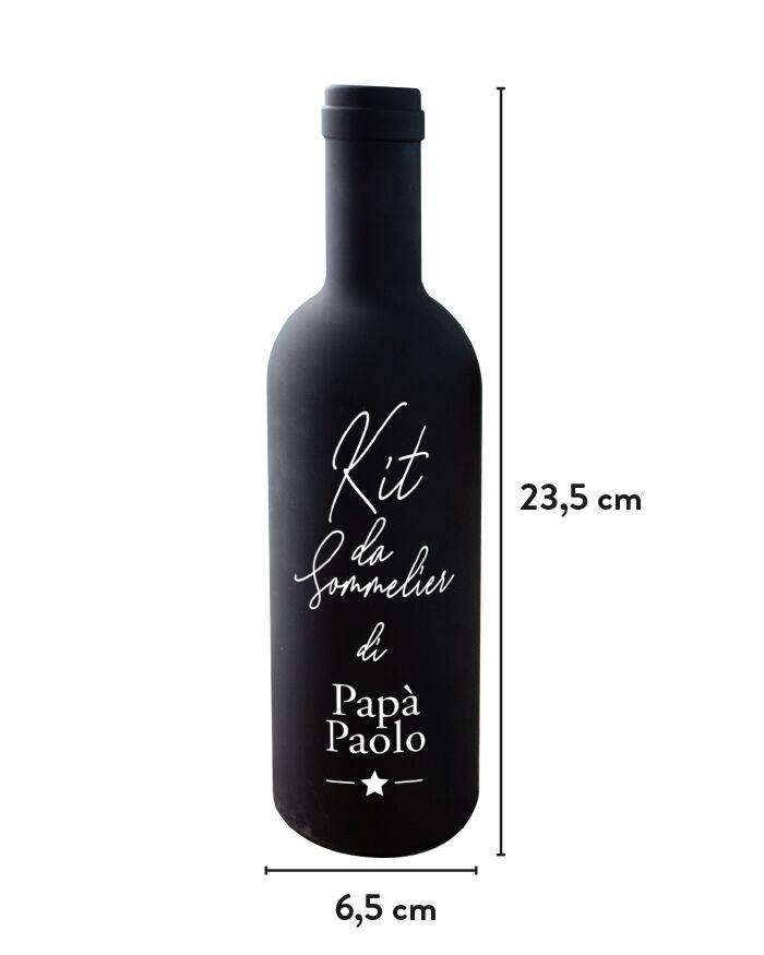 Praticissimo kit da sommelier portatile a forma di bottiglia di vino, dall’elegante effetto opaco, personalizzabile con il nome del tuo papà. Perfetto da regalare al tuo papà amante del vino, avrà un set da esperto sommelier da utilizzare in occasione delle cene più speciali!