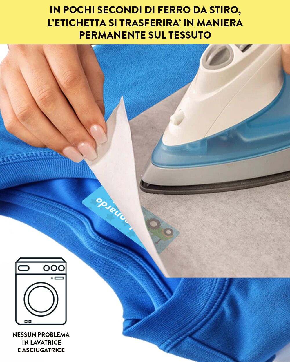 Istruzioni di lavaggio: si consiglia di preferire cicli di lavaggio a media temperatura (es. 40°C) e di non stirare direttamente sopra le etichette, ma preferire una stiratura a rovescio o attraverso un apposito panno protettivo. Inoltre, è possibile asciugare i capi anche in asciugatrice, senza rovinare la qualità dell’etichetta.