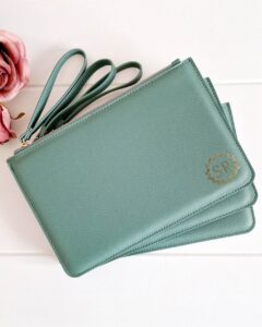 Set di 3 Pochette in Ecopelle Personalizzate con Iniziali Oro e Decorazione Alloro: dona qualcosa di veramente speciale alle invitate dell’addio al nubilato.