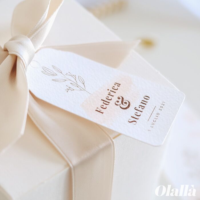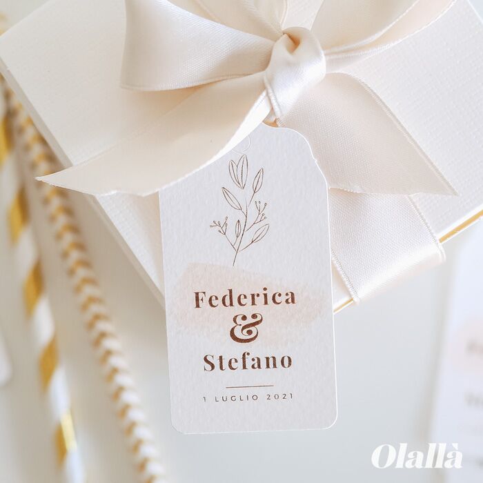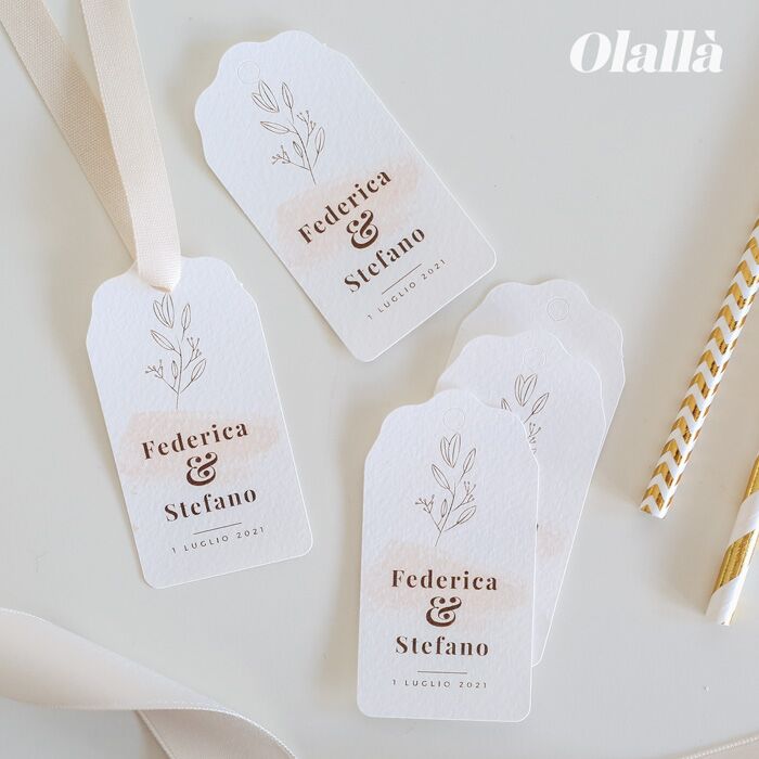 Eleganti tag di carta pregiata per bomboniere con decoro botanico nei toni dell’acquerello rosato, personalizzati con i nomi e la data del tuo evento. Questi tag di carta sono perfetti per confezionare le bomboniere del tuo matrimonio o anniversario.