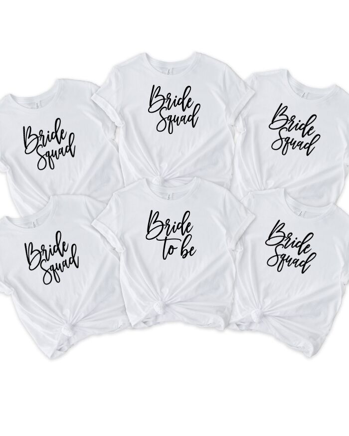 Il set comprende 5 t-shirt: una maglietta con la scritta “Bride to be” e 4 magliette con la scritta “Bride Squad”.
