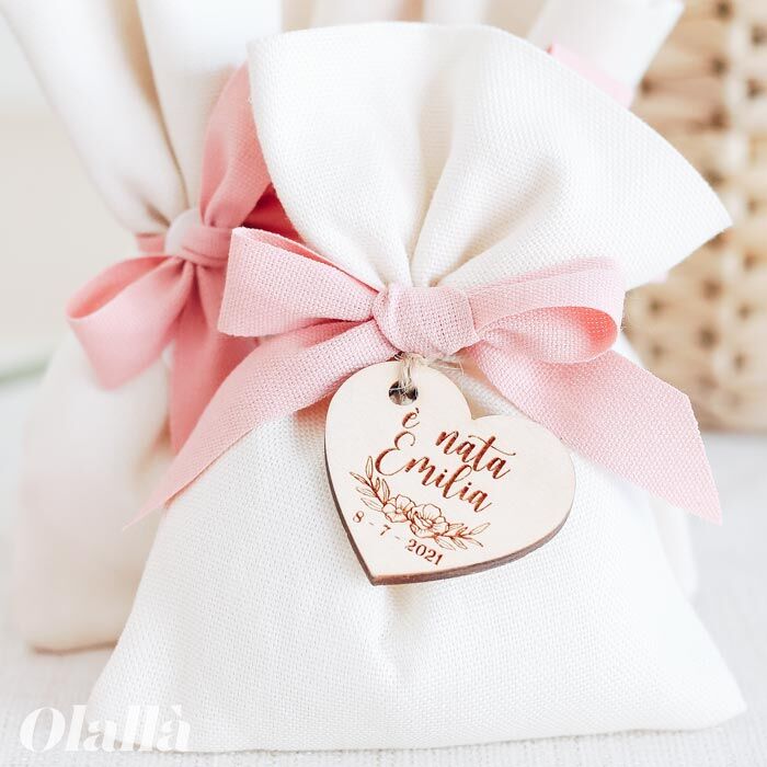 Delizioso sacchettino in cotone portaconfetti con etichetta in legno a cuore personalizzata con dedica e un decoro floreale. Ideale per realizzare una bomboniera di nascita, battesimo, comunione o cresima semplice ma elegante allo stesso tempo.
