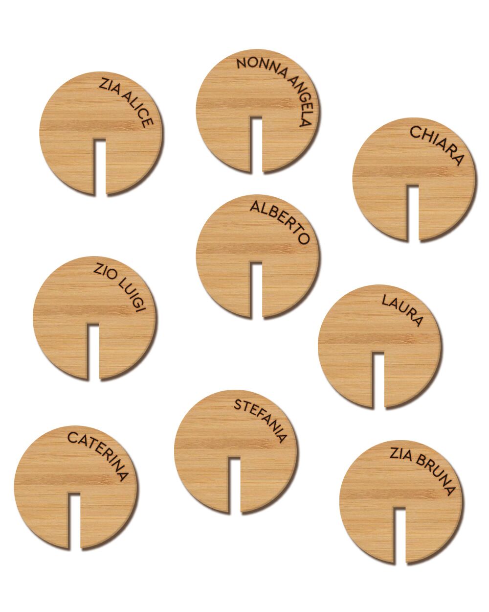 Segnaposto tondi in legno personalizzati con incisione a laser.