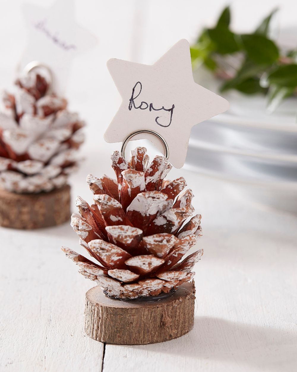 Crea un’atmosfera calda e accogliente con questi raffinati segnaposto a tema natalizio! Ogni segnaposto è composto da una pigna innevata montata su una base in legno naturale, con una clip superiore per inserire il bigliettino con il nome degli ospiti. Perfetti per decorare la tua tavola durante le feste, donano un tocco rustico e autentico al tuo Natale.