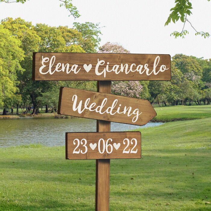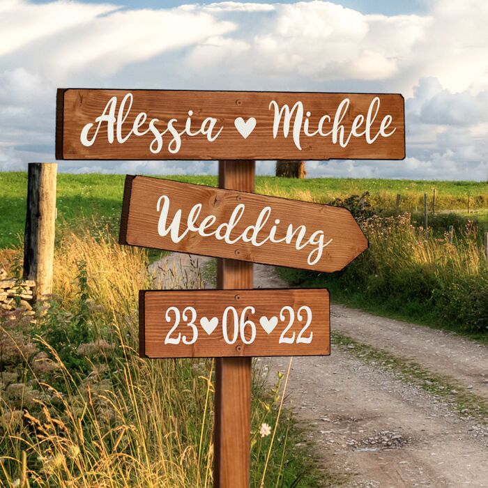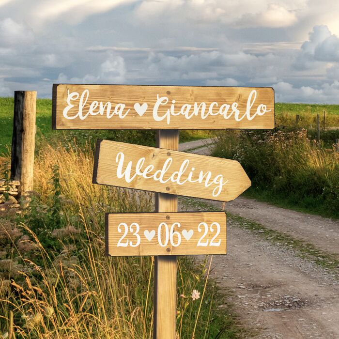 Set di due cartelli e una freccia personalizzati in stile country chic. Questo set, formato da due cartelli rettangolari e una freccia, sarà perfetto per dare il benvenuto a tutti gli invitati del tuo grande giorno. I cartelli sono personalizzabili scegliendo la finitura del legno desiderata, la frase e la data, per rendere ogni insegna unica, come la vostra unione del resto! Aggiungi un tocco indimenticabile alla tua location dei sogni, e aiuta ogni invitato a trovare il posto giusto nel giorno del vostro sì!