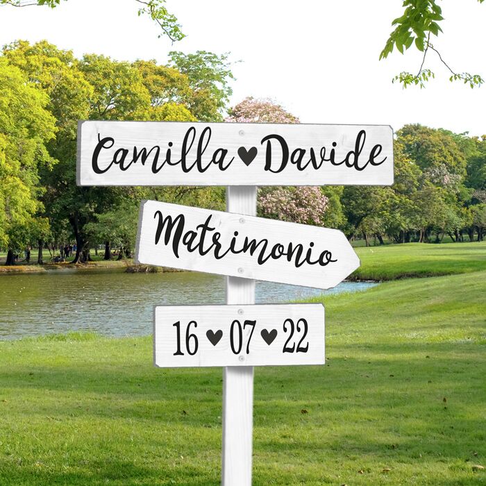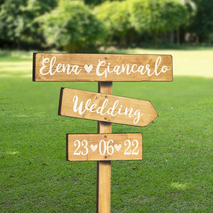 I due cartelli e la freccia sono realizzati in autentico abete spesso 1,5 cm con scritta personalizzata. La scritta calligrafica può essere personalizzata nel campi presenti nella pagina del prodotto. Nella prima frase, i due nomi saranno serparati dal cuore. Nel prezzo è compreso anche il palo di un metro e mezzo di altezza che ti permetterà di montare comodamente a casa il tuo set di cartelli.