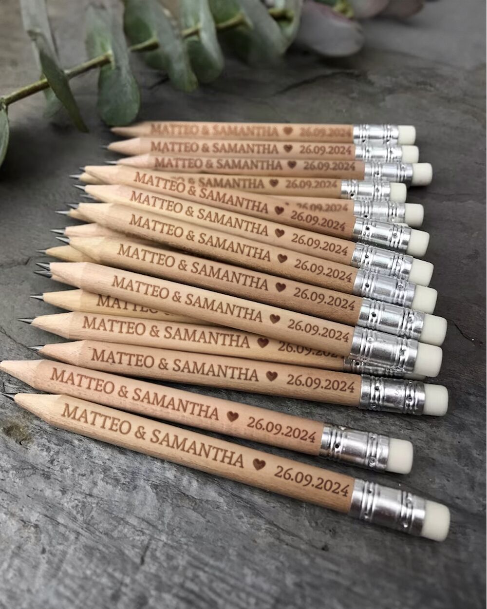 - Personalizzazione che Emoziona: Con i nomi degli sposi e la data incisi a laser, ogni matita diventa un simbolo dell’evento e un ricordo affettuoso.