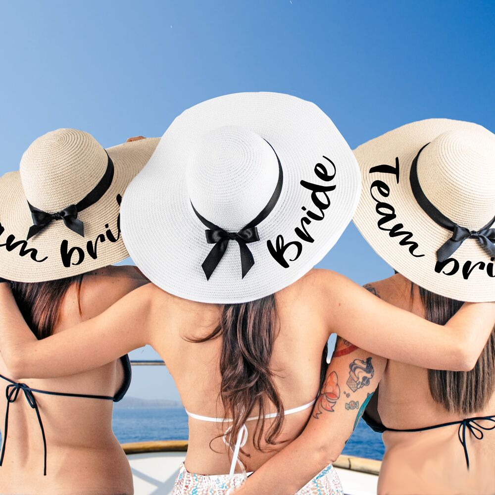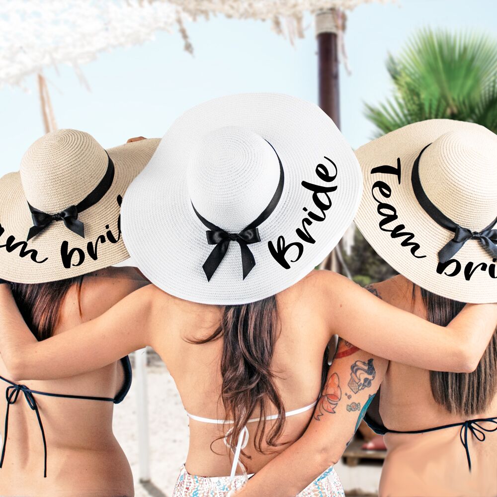 Fantastico e stilosissimo set di cappelli da spiaggia in paglia personalizzati con il nome, l’accessorio must-have per un addio al nubilato in grande stile! Crea il tuo #teambride perfetto insieme alle tue amiche con questi fantastici cappelli di paglia che puoi personalizzare con il nome delle invitate o con l’hashtag #teambride: sarà un gadget immancabile per una giornata memorabile!