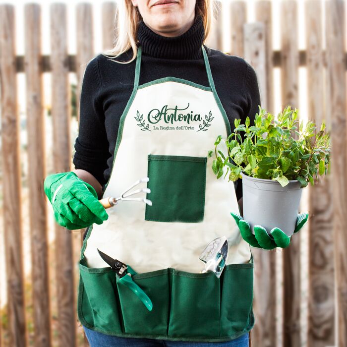 Delizia la tua donna, amica o nonna amante del giardinaggio con questo set personalizzato dedicato a lei! Le sessioni di potatura, la fase di rinvaso e la cura del giardino non saranno mai stati così efficientemente organizzati grazie a questo prezioso set da giardinaggio personalizzato unicamente per lei. Personalizza il grembiule con il suo nome e una breve frase: è il modo migliore per incoronarla ufficialmente come Regina dell’Orto!