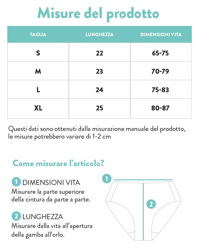 La mutandina è disponibile in varie misure ed è costituita per il 90% in poliestere e il 10% in spandex.
