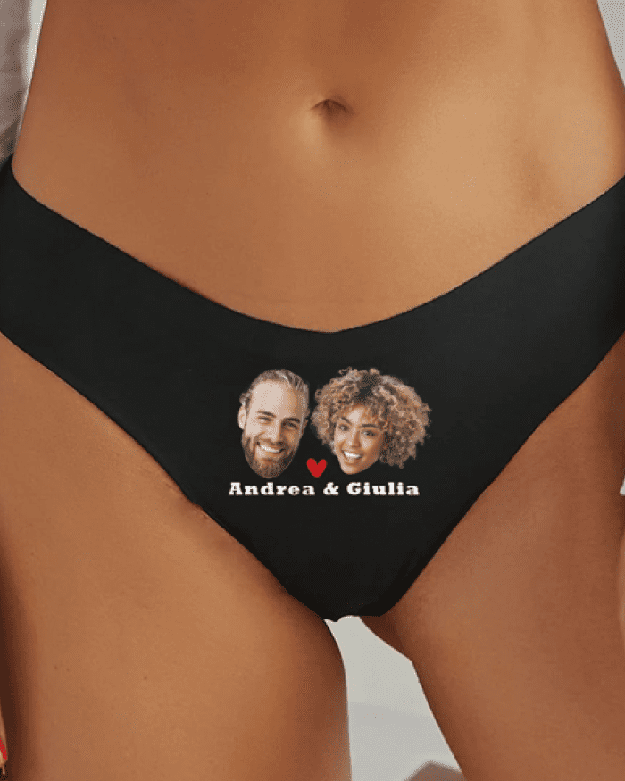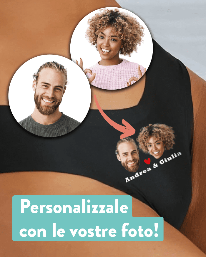 Personalizza e rendi unico il tuo intimo, inserendo la foto della vostra faccia e i vostri nomi negli appositi spazi. La personalizzazione sarà impreziosita da un cuoricino rosso.