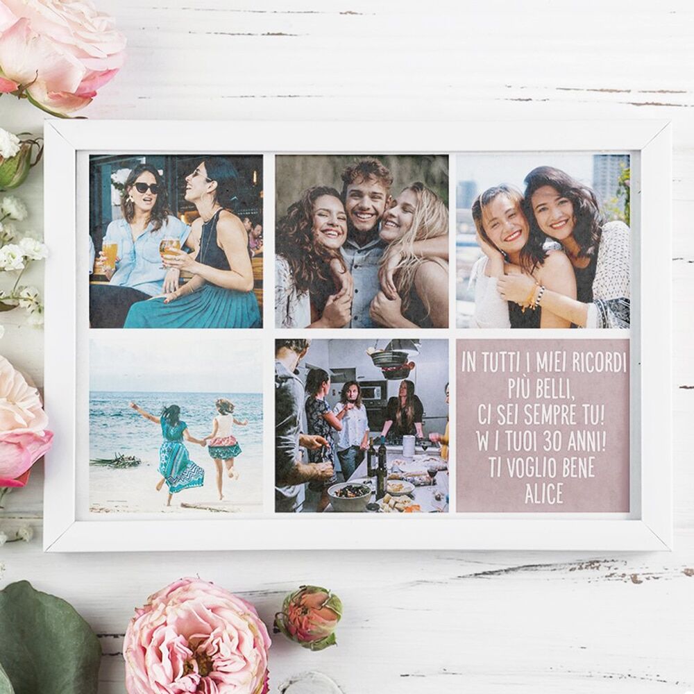 Stampa con foto collage dei vostri momenti più belli. Realizza un regalo per i 30 anni della tua migliore amica che sia davvero spettacolare, per ricordarle quante avventure avete passato assieme e quanto affetto vi lega. Il quadro viene impreziosito anche da una dedica personalizzata con le tue parole!