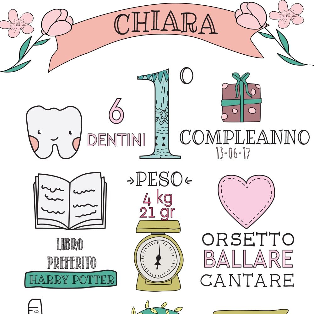Il primo anno passa in fretta! In occasione del primo compleanno della tua bimba ricorda i passi principali che ha compiuto con una stampa di questo genere da appendere in cameretta, su cui inserire nome, caratteristiche fisiche, dentini che sono spuntati, aneddoti particolari ecc. In questo modo avrai l’occasione di ricordare, anche dopo tanti anni, quello che ha combinato la tua piccolina in questo primo anno di vita!