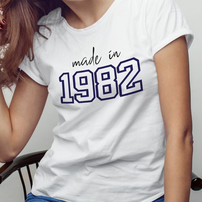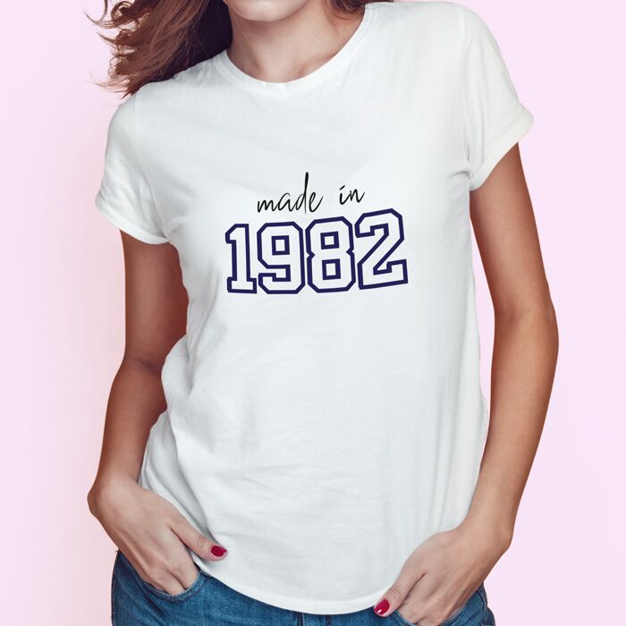T shirt dallo stile trendy con maniche risvoltate e scollo a girocollo personalizzata con la stampa dell’anno di nascita in stile collegiale. Ideale per fare un regalo alla vostra donna che compie gli anni, che sia vostra sorella, mamma, o amica e che desidera esibire con orgoglio la propria annata!