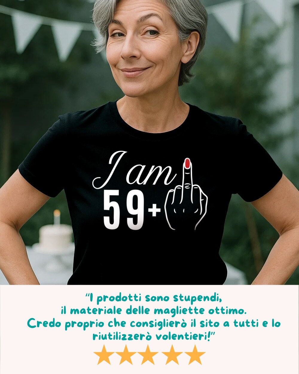 La grafica ironica con la scritta “I AM [età]” accompagnata da un bel dito medio alzato è una dichiarazione d’intenti, un modo coraggioso, divertente e totalmente fuori dagli schemi per celebrare un compleanno importante con una risata e tanta personalità.