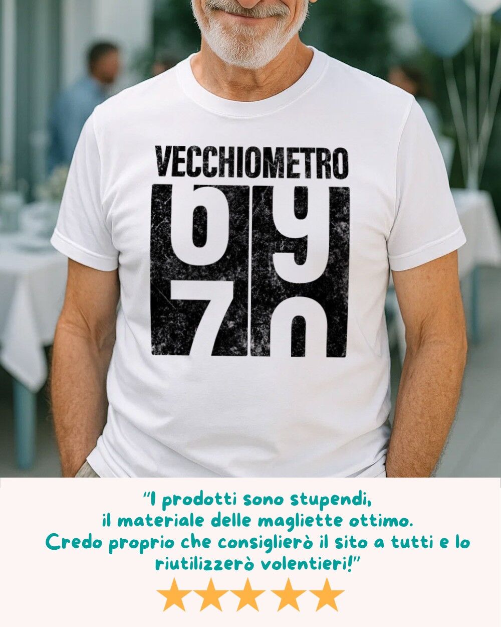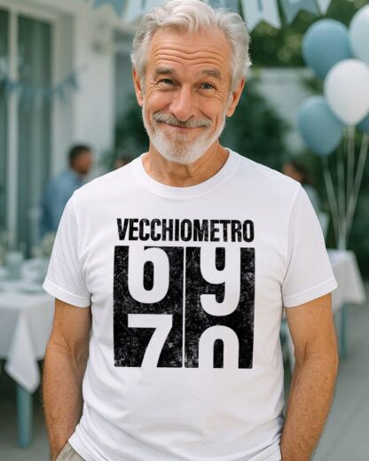 La maglietta personalizzata con età compiuta può essere adattata a qualsiasi numero: 30, 35, 40, 50, 60, 70… nessun limite! Basta indicarci l’età del festeggiato e noi provvederemo a stamparla accanto all’indicatore del “Vecchiometro”, per un risultato ironico e perfettamente su misura.