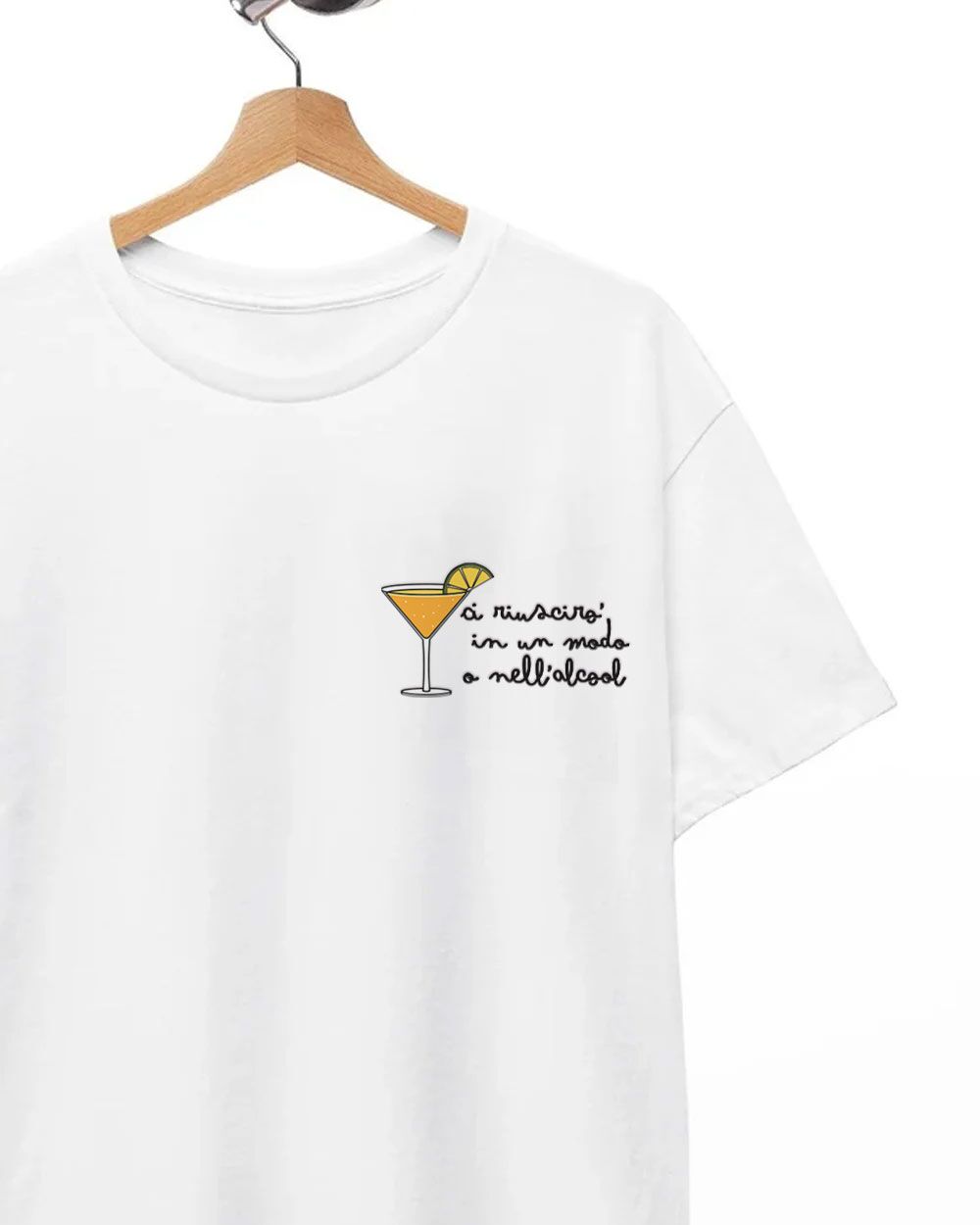 - T shirt a mezze maniche personalizzata con scritta Ci Riuscirò in Un Modo o Nell’Alcool con disegno di un bicchiere con Cocktail
