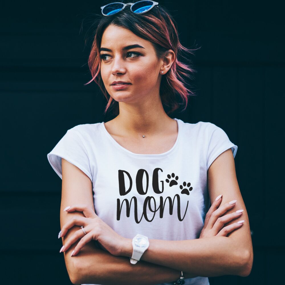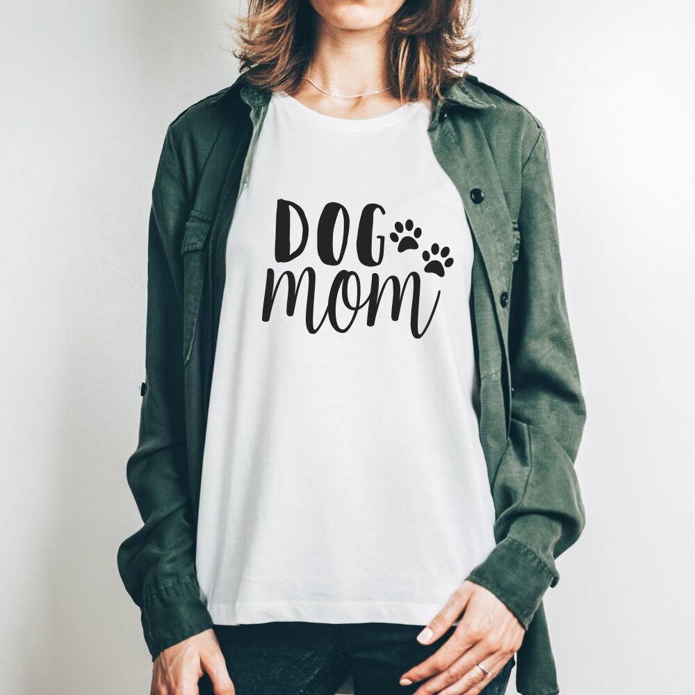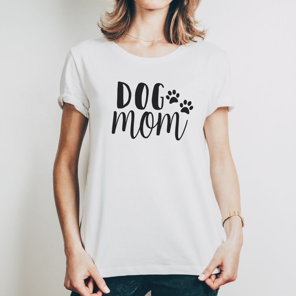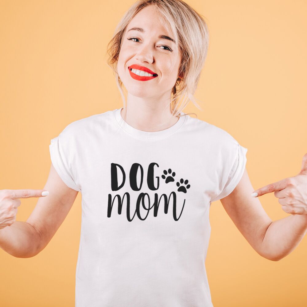 Bellissima T-Shirt per la mamma di un pelosetto con la scritta “Dog Mom”. Questa bellissima t-shirt sarà un regalo perfetto per l’amica che ha da poco adottato un cucciolo e si sente una “Dog Mom” a tutti gli effetti! La scritta può essere adattata anche nella versione “Cat Mom” oppure puoi inserire proprio il nome del tuo animaletto!
