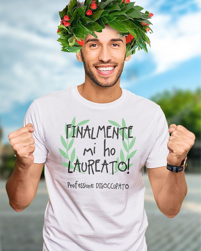 Spiritosa Maglietta con scritta “Finalmente mi ho laureato”, perfetta per essere regalata in occasione della laurea del vostro neo dottore, che potrà festeggiare questo speciale traguardo con una T-Shirt goliardica che ironizza sulla validità del suo titolo di studio e sul futuro che la attende.