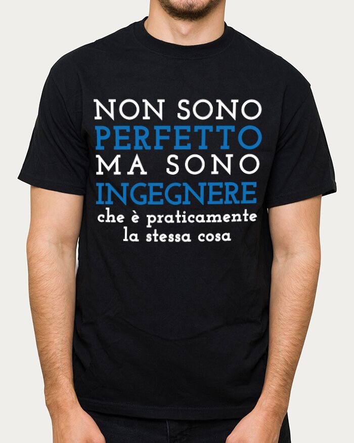 Si sa, i nostri amici ingegneri non brillano per umiltà e spesso sono convinti di essere i migliori del mondo! Con questa ironica maglietta farai un regalo davvero gradito e non mancherai di strappare un sorriso. Nell’immagine ti proponiamo la scritta “Non sono perfetto ma sono ingegnere – che è praticamente la stessa cosa” ma la parola “ingegnere” può essere sostituita con qualsiasi altra professione.