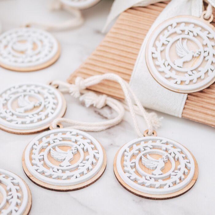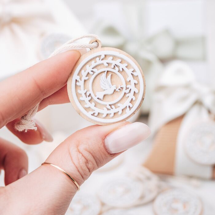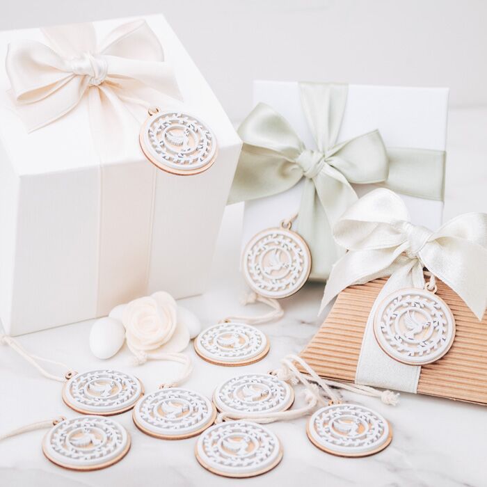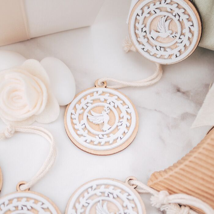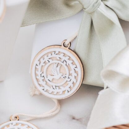 Bellissimo set di 20 tag in legno con Colomba e fregi in legno. Perfetta per essere usata come decorazione finale per la tavola della tua cerimonia oppure per completare le tue bomboniere. Una decorazione pronta stupire tutti i tuoi invitati.