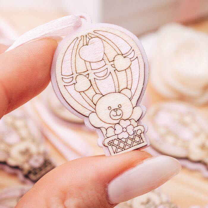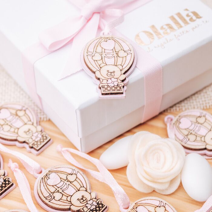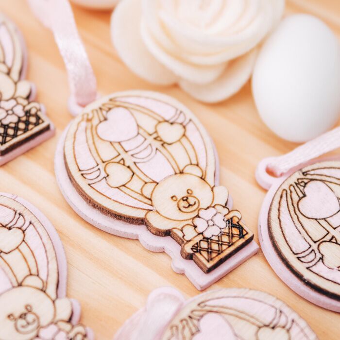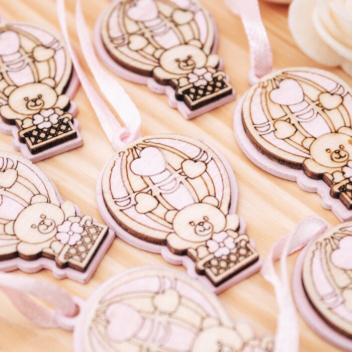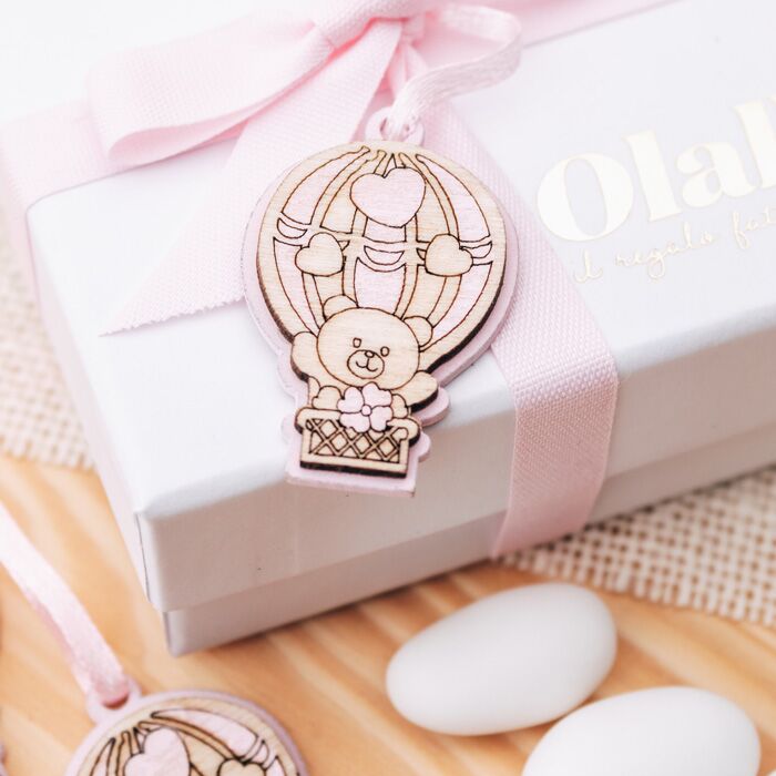 Set da 20 decorazioni a forma di mongolfiera con orsetto in legno. Perfette per essere usata come decorazione finale per la tavola della tua cerimonia oppure per completare le tue bomboniere.