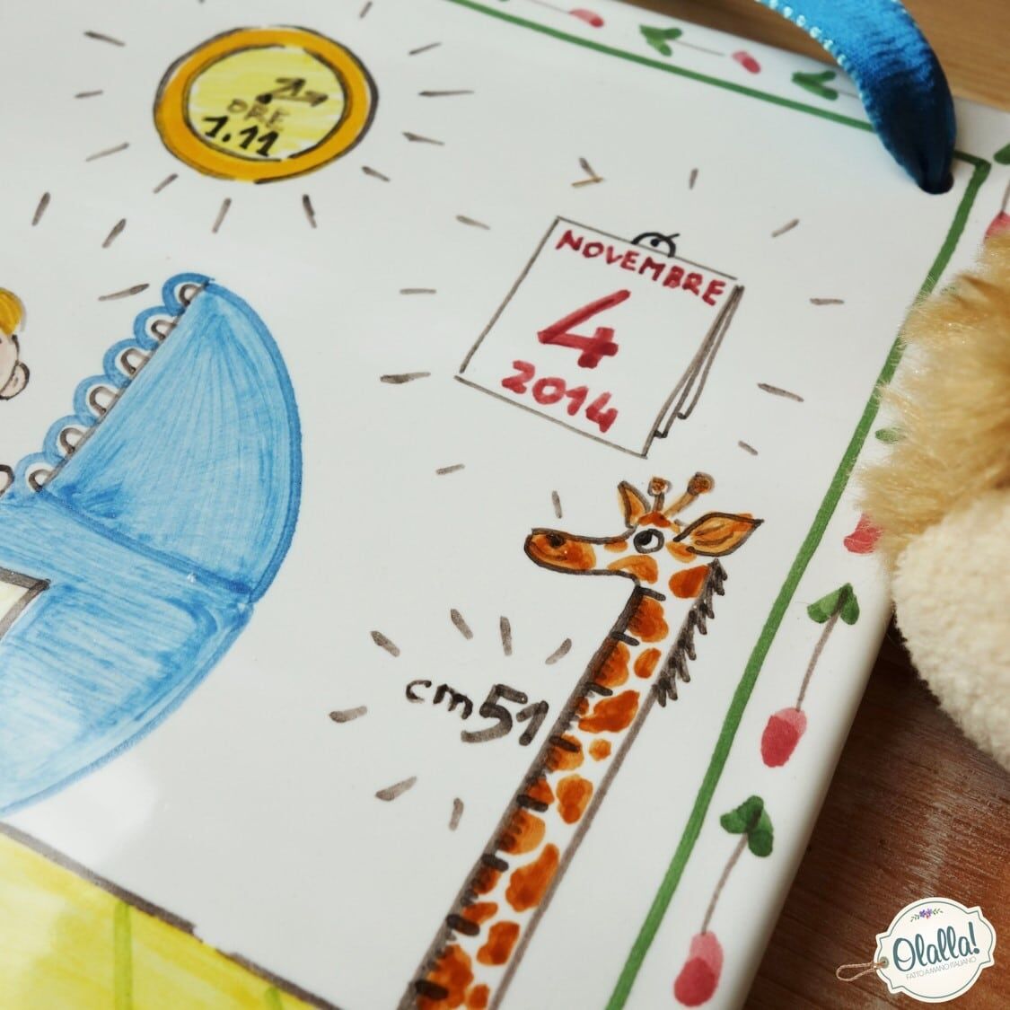 E’ arrivato un bambino, e c’è una manciata di dati che creano dal primo giorno una storia tutta sua: il suo nome, il giorno della sua nascita, l’ora, che tempo faceva, e poi il suo peso, la lunghezza, come aveva i capelli. Tutte queste notizie sono raccontate da una formella che arrederà allegramente la sua cameretta. Un dolce e originale regalo per la sua mamma, ma anche un prezioso ricordo per lui stesso in futuro.