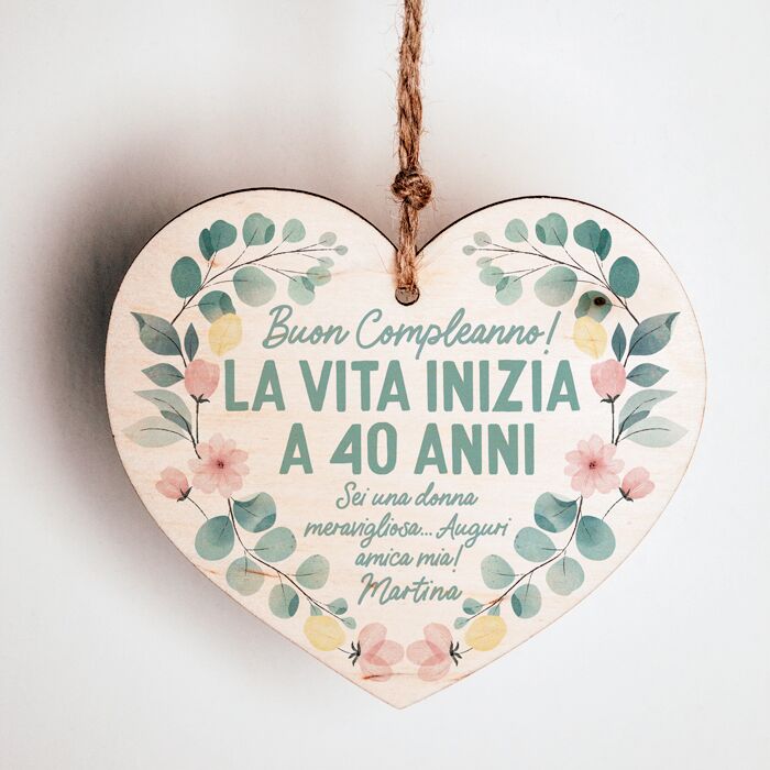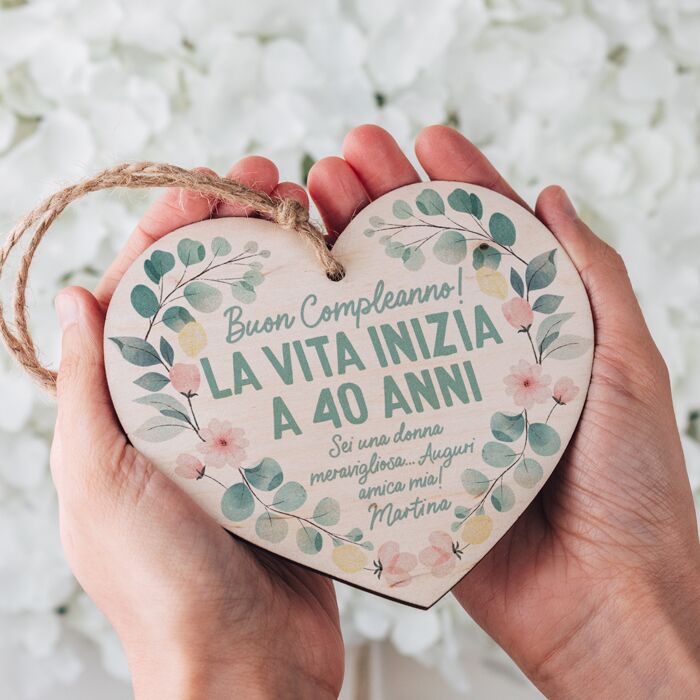 Splendida targhetta a forma di cuore in legno con decoro floreale pastello personalizzabile con la tua dedica sul compleanno. Per fare un regalo di compleanno tenero e dolce o accompagnare un mazzo di fiori come biglietto originale e da conservare per sempre.