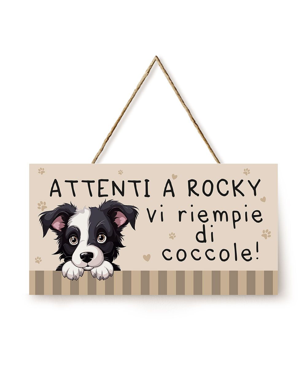Oltre all’immagine personalizzata del tuo cucciolo, puoi aggiungere una frase di tua scelta. Che sia un simpatico avvertimento, un caloroso benvenuto, o una frase che rifletta il carattere unico del tuo cane, questa personalizzazione rende la targhetta veramente tua.