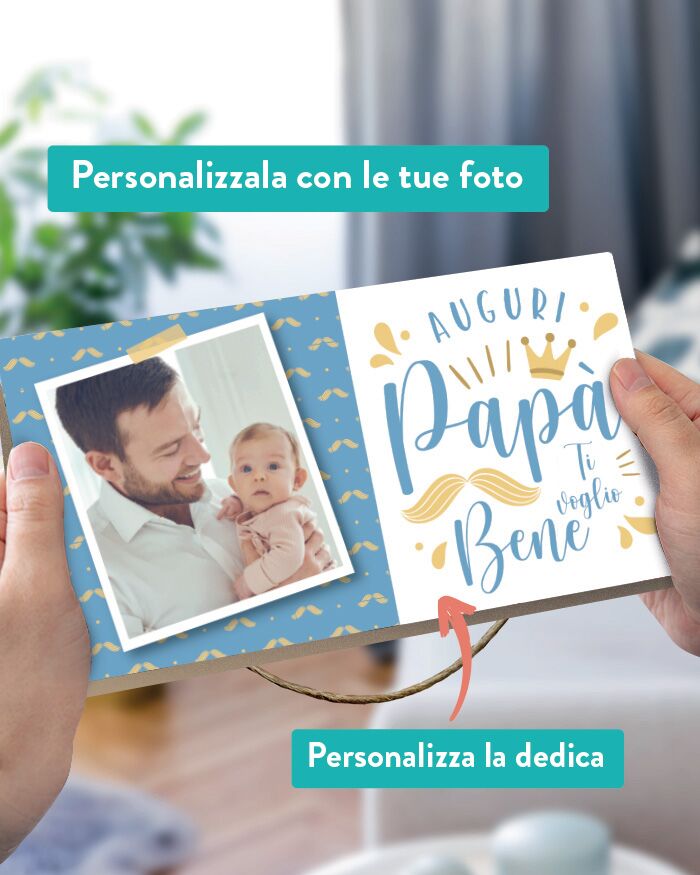 - PERSONALIZZABILE: personalizza la targhetta con una foto assieme al tuo papà. Sarà circondata da simpatici baffi e accompagnata da una dolcissima dedica!