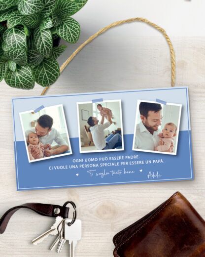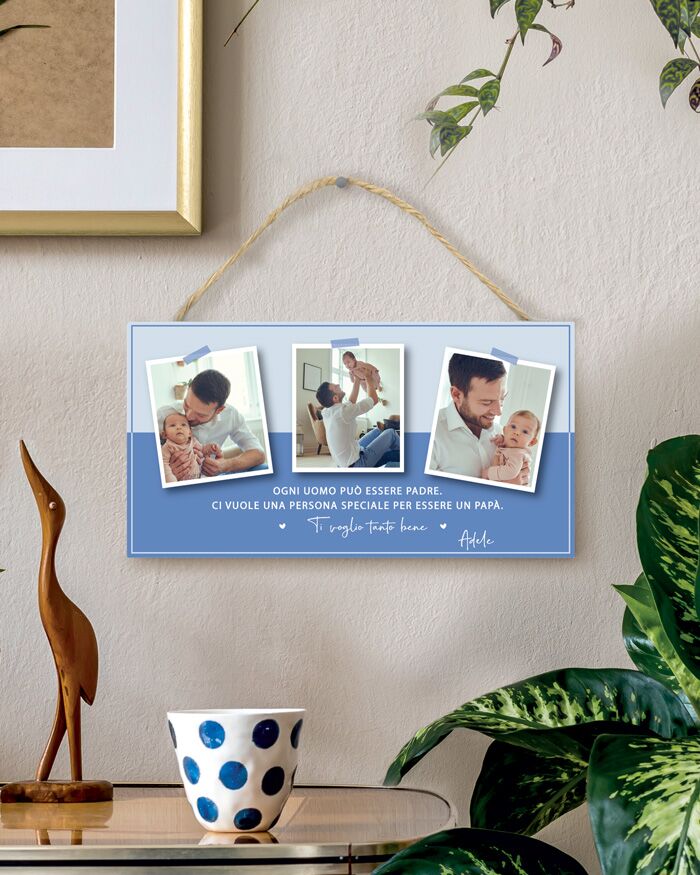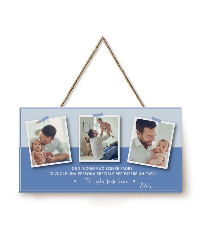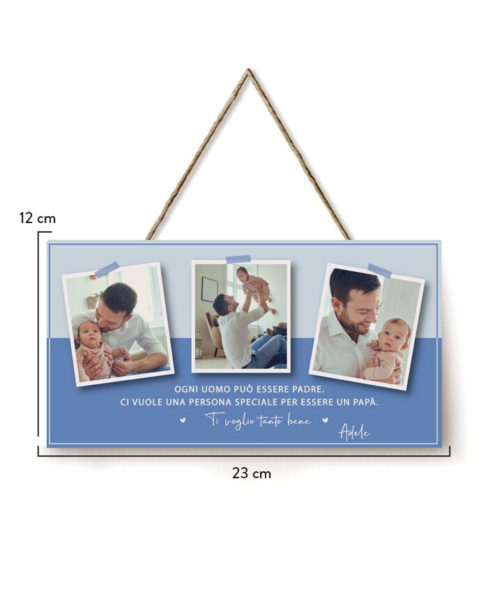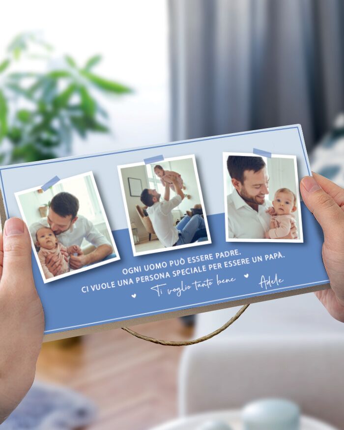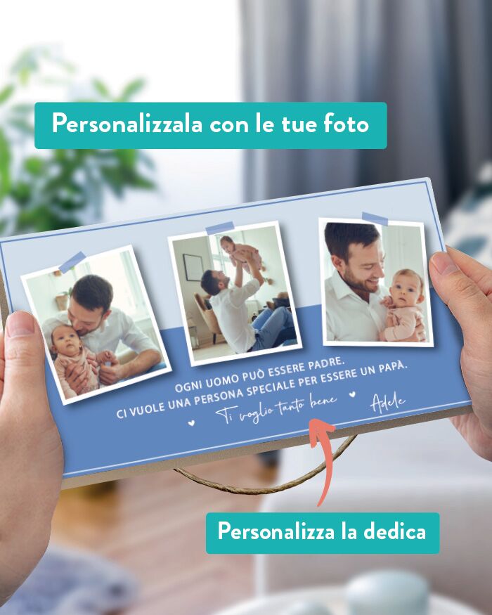 Segui le indicazioni e personalizza la targhetta con 3 foto insieme al tuo papà. Scrivi una frase principale e una dolce dedica finale. ATTENZIONE: le foto devono essere luminose, centrate, con i volti ben visibili e di alta qualità.