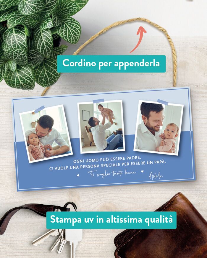 - DA APPENDERE: una targhetta con cordoncino perfetta per essere appesa nell’ufficio del tuo papà, nel suo studio ma anche in casa. Un’ottima alternativa al classico portafoto!
