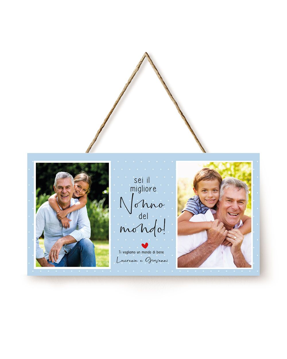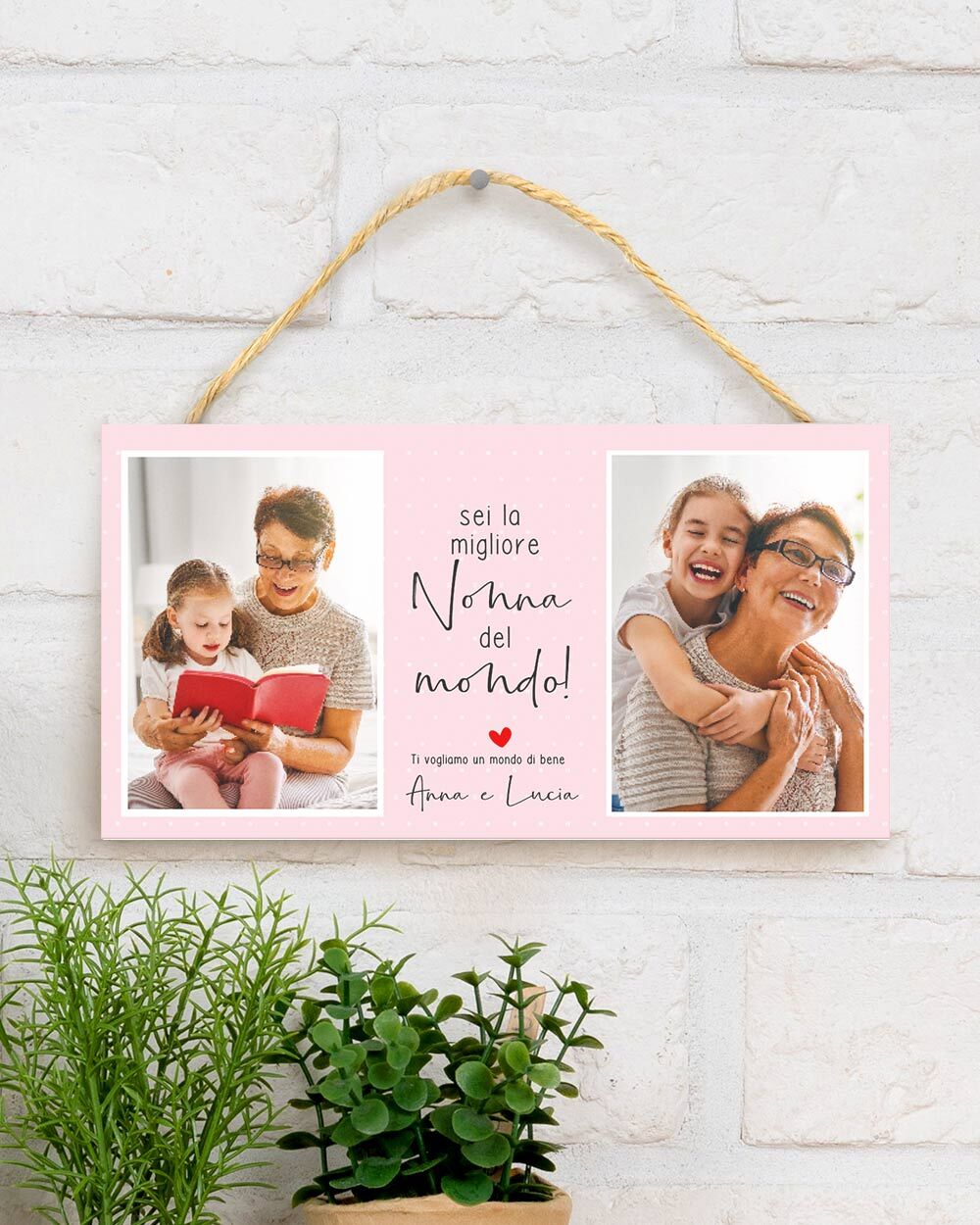 Puoi personalizzare la tua targhetta caricando una o due foto a tua scelta e aggiungere una dedica unica, proprio come il legame che ti unisce ai tuoi nonni.