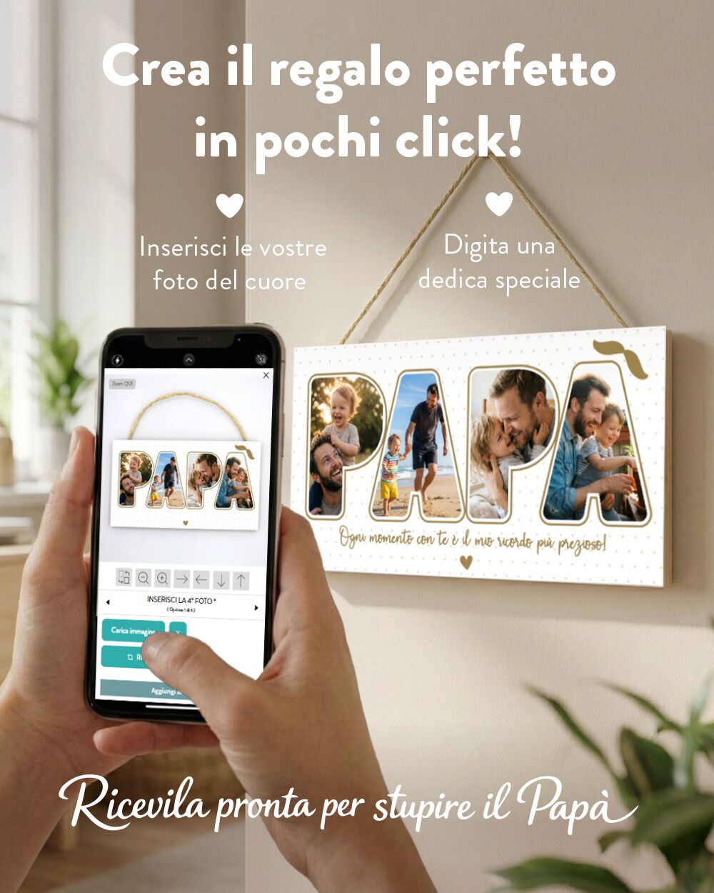 Trasformare questa targa in una magnifica foto regalo papà è un’esperienza creativa e divertente! Grazie al nostro configuratore, potrai vedere subito l’anteprima della tua creazione, ma dietro a quello schermo ci sono i nostri grafici e artigiani pronti a prendersi cura del tuo capolavoro. Dovrai semplicemente caricare quattro foto speciali (ti suggeriamo scatti luminosi, centrati e di alta qualità) che verranno “incastonate” magistralmente all’interno delle quattro lettere della parola “PAPÀ”. A dare un pizzico di allegria ci penserà l’accento, trasformato per l’occasione in un simpatico paio di baffi! Infine, scrivi la tua dolce dedica: noi la stamperemo con dedizione artigianale, accompagnandola con un tenero cuoricino.