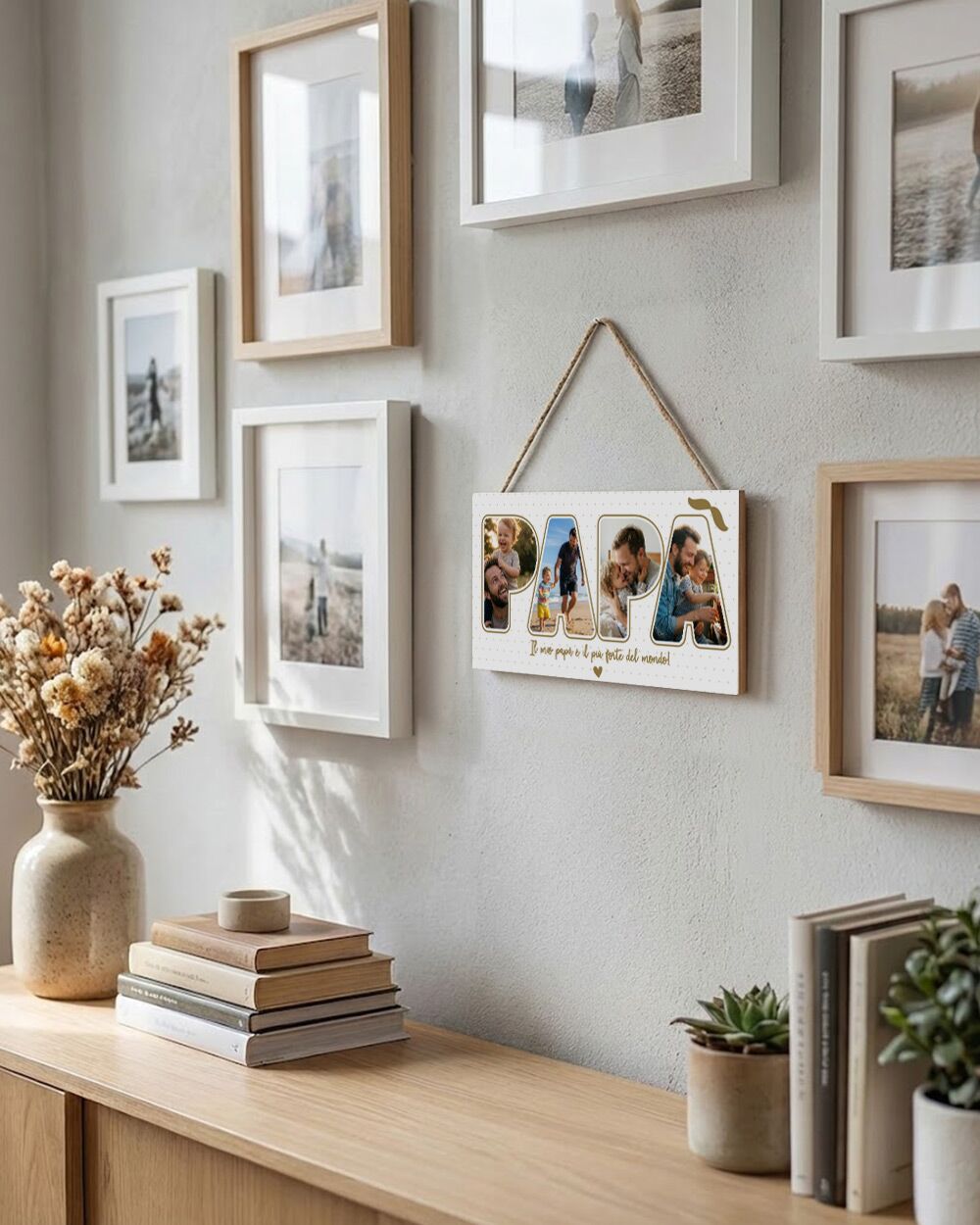 Questa targhetta personalizzata con foto è un caldo abbraccio di legno che farà emozionare il tuo papà ogni singolo giorno. Immagina la sua sorpresa nel vedere i vostri ricordi più preziosi prendere forma tra le lettere della parola “Papà”, accarezzando con lo sguardo i momenti felici impressi su una superficie liscia e curata. Un piccolo angolo di gioia, pronto da appendere in salotto o in ufficio, capace di trasformare una parete anonima in un dolcissimo rifugio di amore familiare.