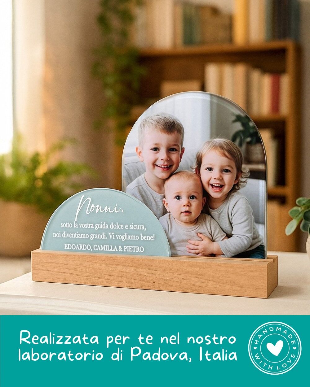 Ogni targhetta per nonni viene personalizzata e preparata con cura nel nostro laboratorio di Padova, Italia. Qui, grazie a processi moderni uniti all’attenzione artigianale, diamo vita a prodotti unici, pensati per emozionare e resistere nel tempo.