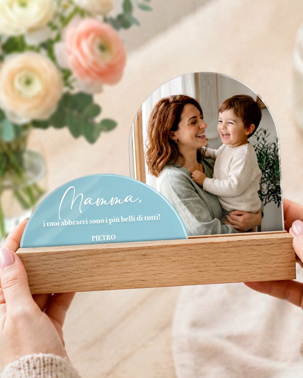 La foto — carica lo scatto che vuoi. Un ritratto di tua mamma, una foto di voi due, un momento di famiglia. Viene stampata a colori sulla placca in plexiglass, con una resa pulita e fedele all’originale.