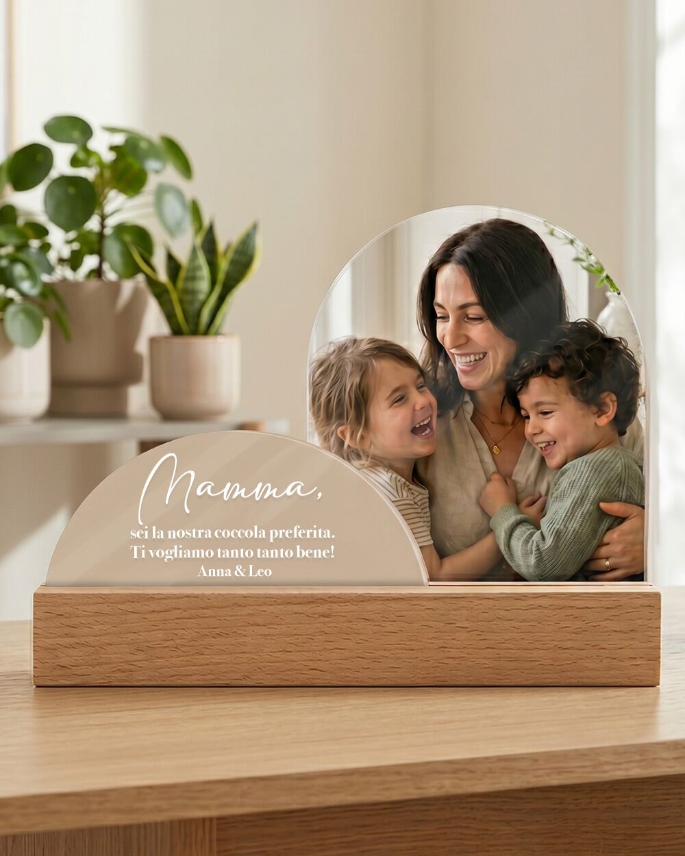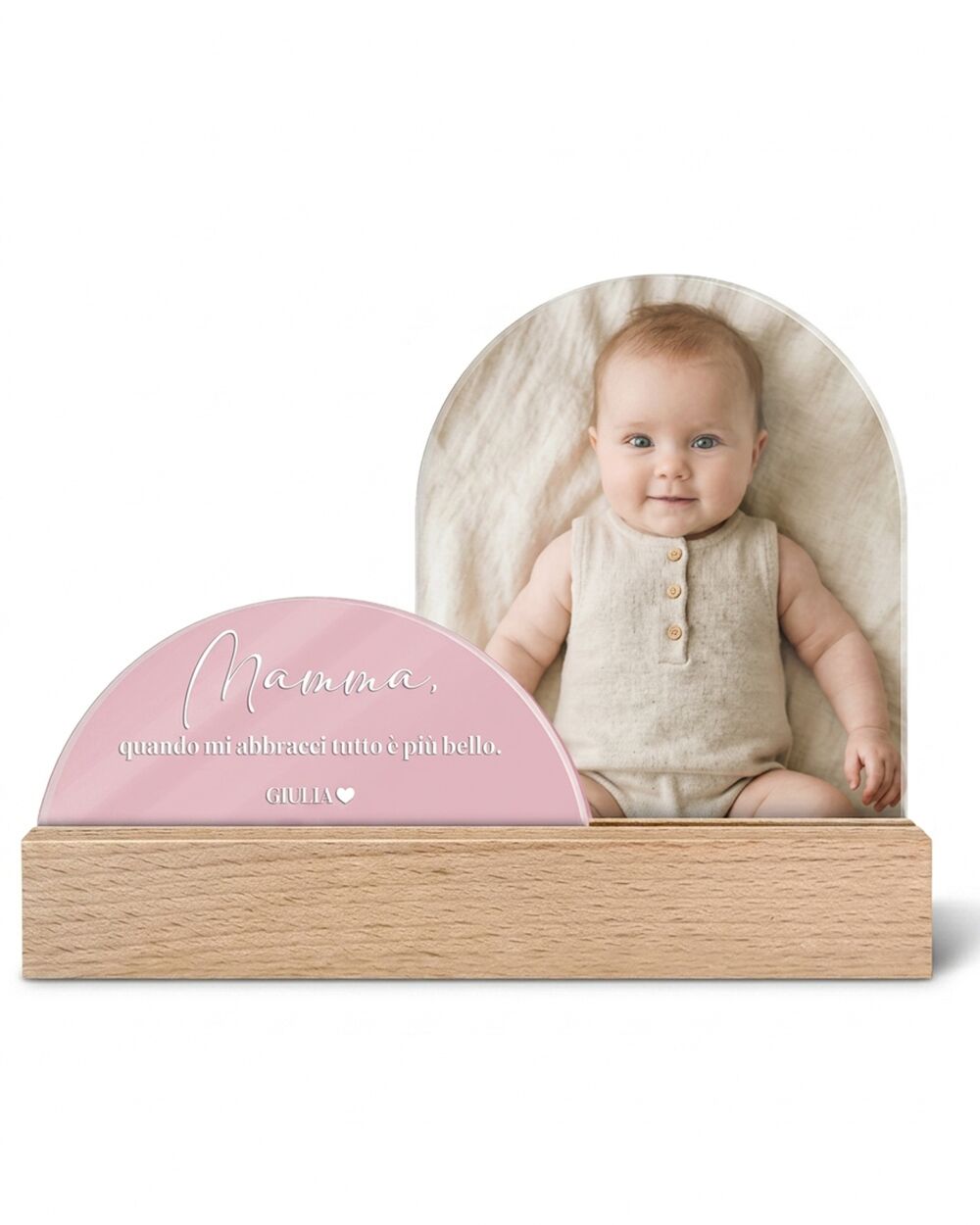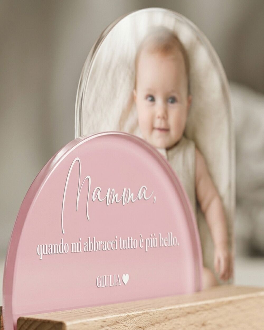 Legno naturale, due lastre in plexiglass removibili: una custodisce la foto che hai scelto tu, l’altra una dedica pensata apposta per lei. Sopra, un titolo breve. Sotto, la tua firma. Al centro, tutto ciò che non riesci sempre a dirle ad alta voce. Un regalo con foto per la mamma che parla la lingua dei ricordi, non quella dei cataloghi.