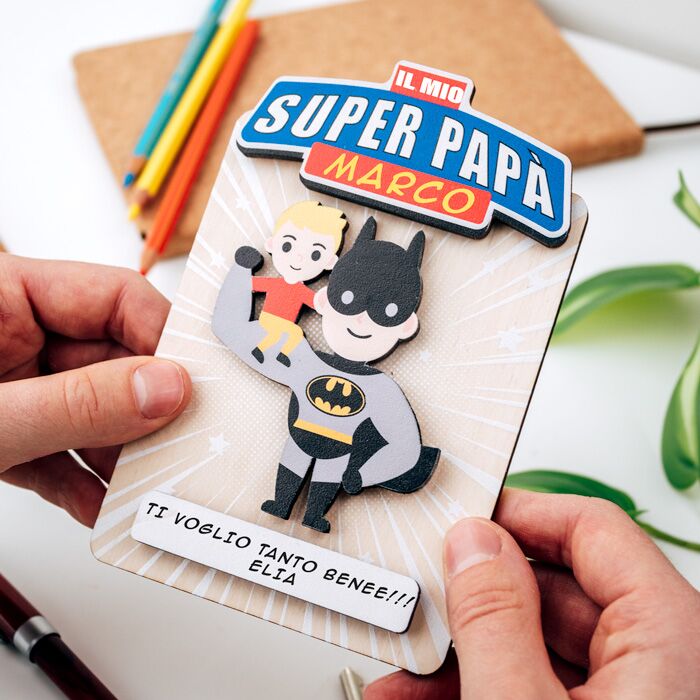 Stupisci il tuo papà con questa bellissima targhetta che lo ritrae come un supereroe con i suoi bimbi sulle braccia! Un regalo perfetto per manifestargli il tuo amore questo 19 marzo.