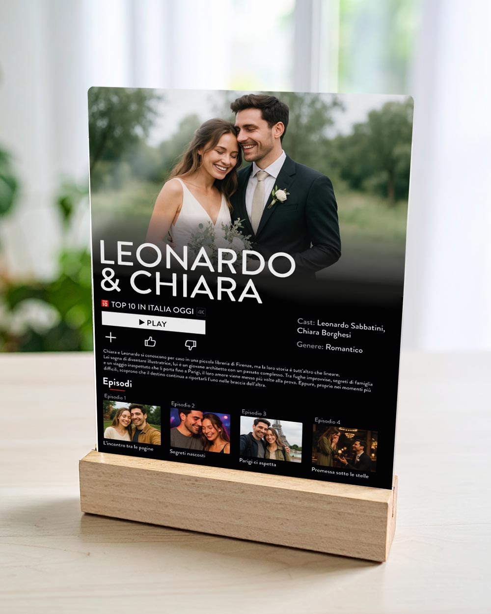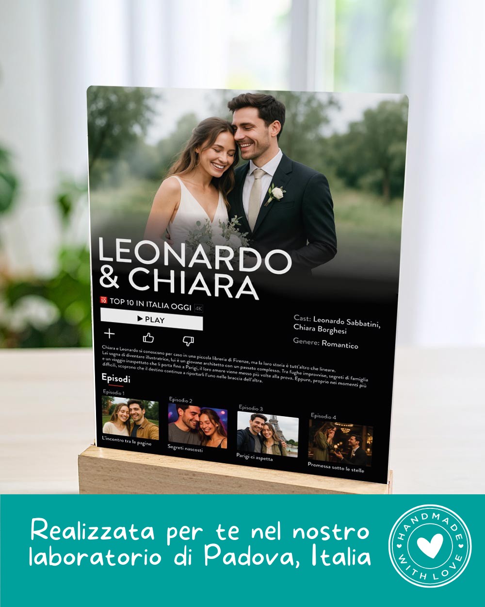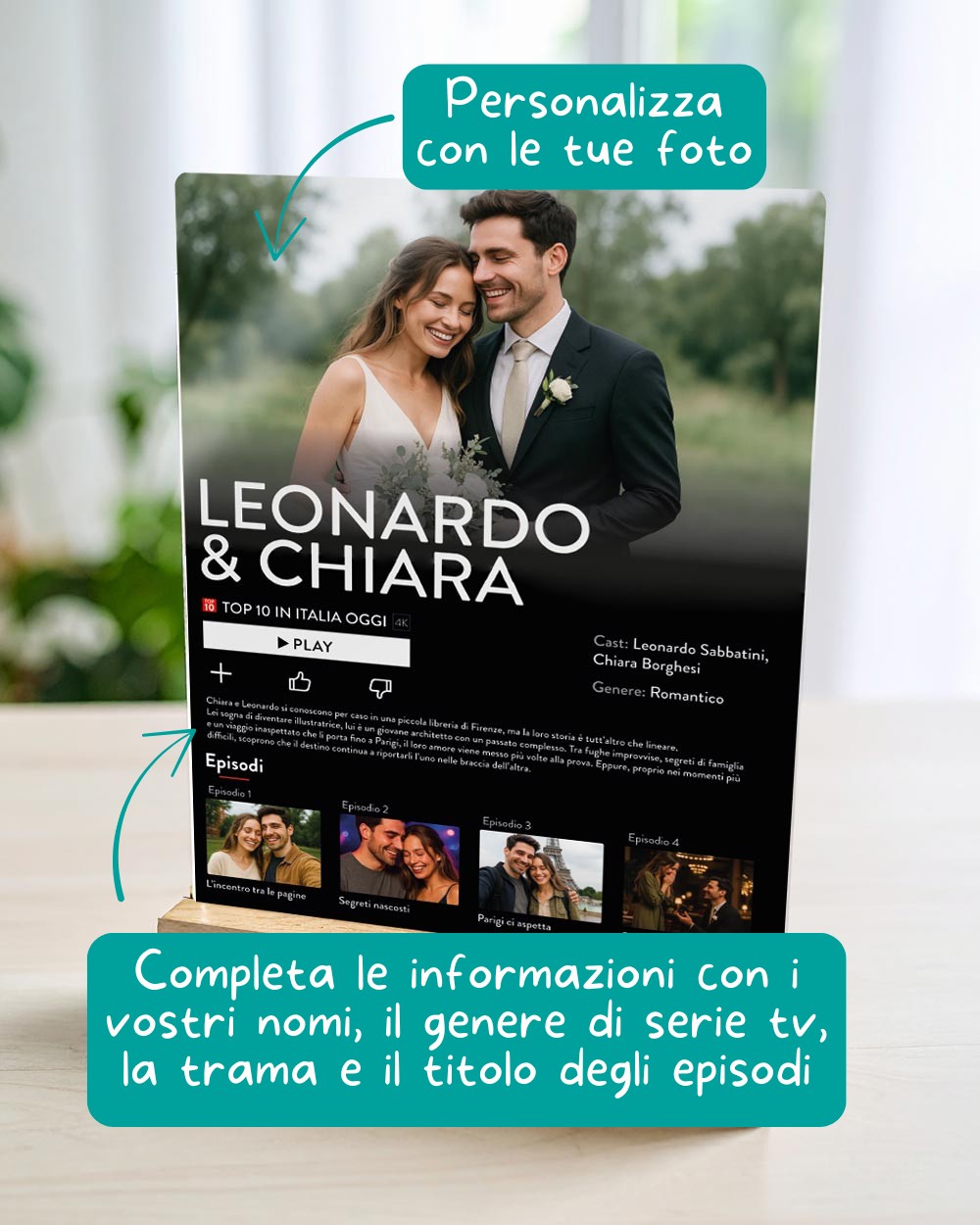 PERSONALIZZAZIONE: personalizza la targhetta con 5 foto, la trama della vostra storia e i vostri nomi.