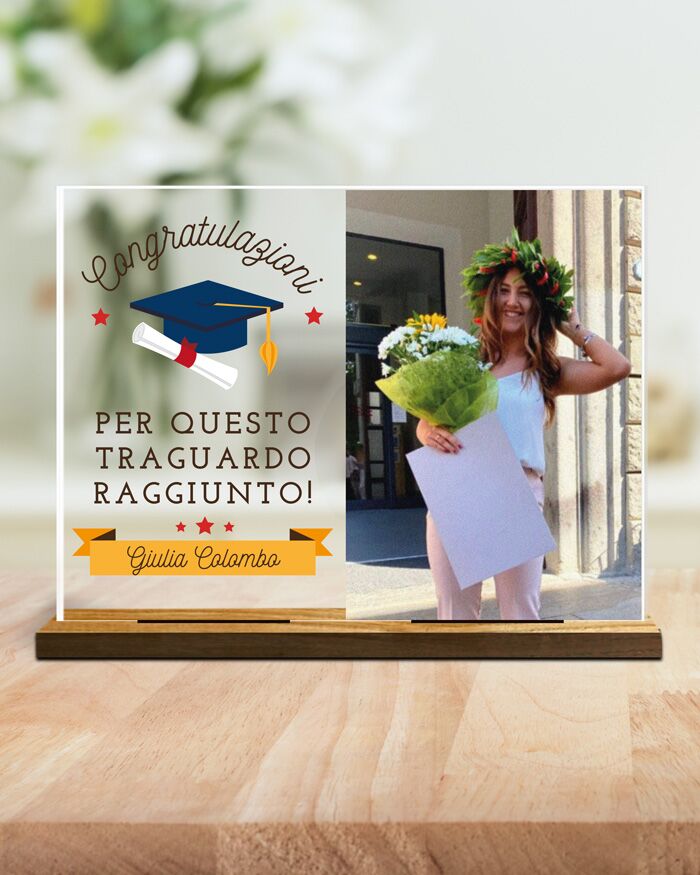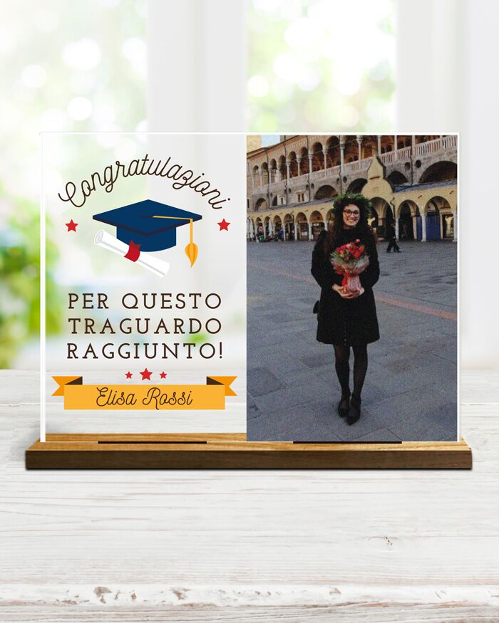 Questa originale targhetta può essere personalizzata inserendo la foto e le frasi che desideri. Sarà un regalo molto gradito dal neo dottore o neo dottoressa che lo riceverà in occasione del conseguimento della sua laurea triennale, magistrale, dottorato o esame di maturità.