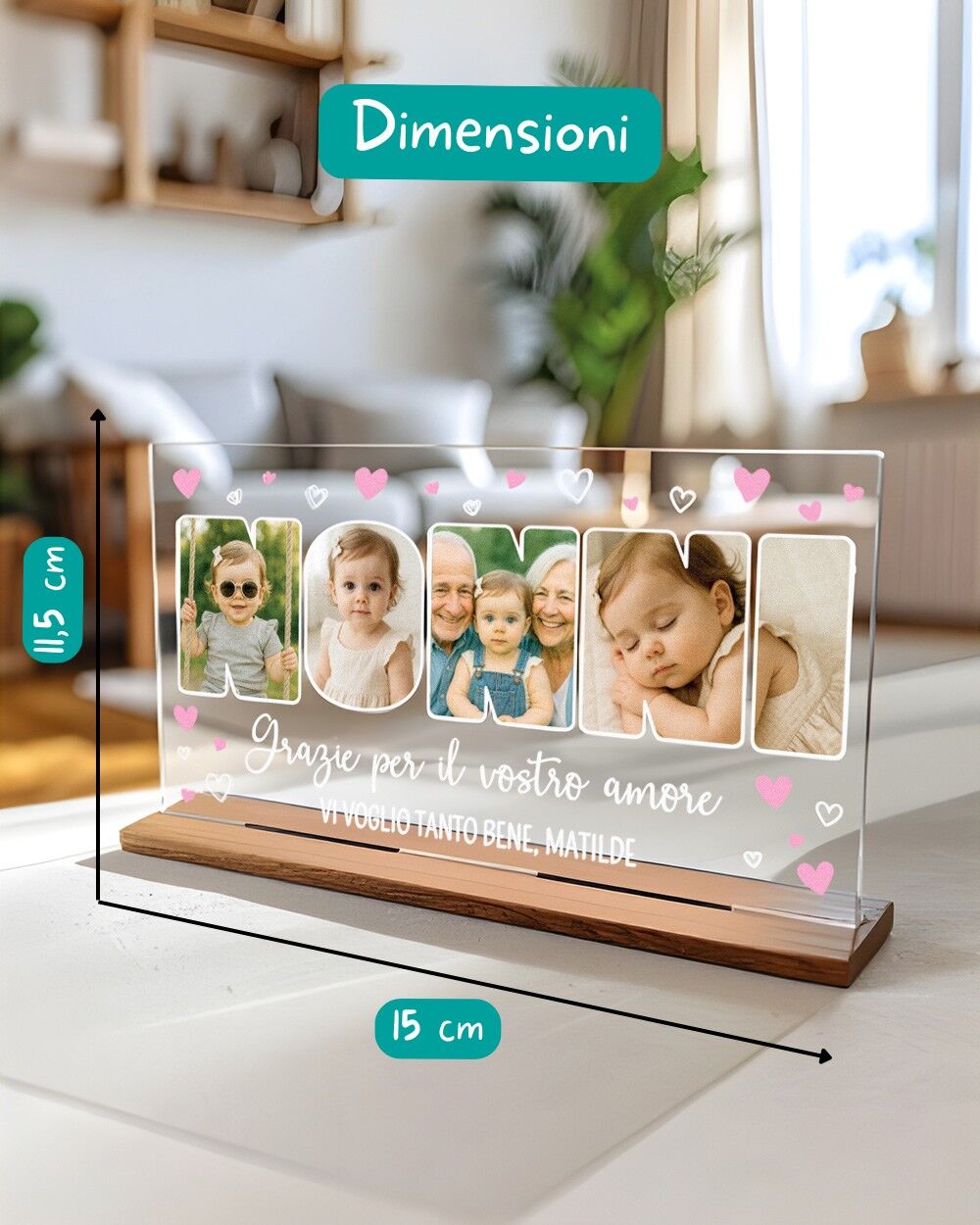 - Foto a tua scelta, stampate con colori brillanti e dettagli nitidi. Verranno inserite all’interno della parola nonno, nonna o nonni.