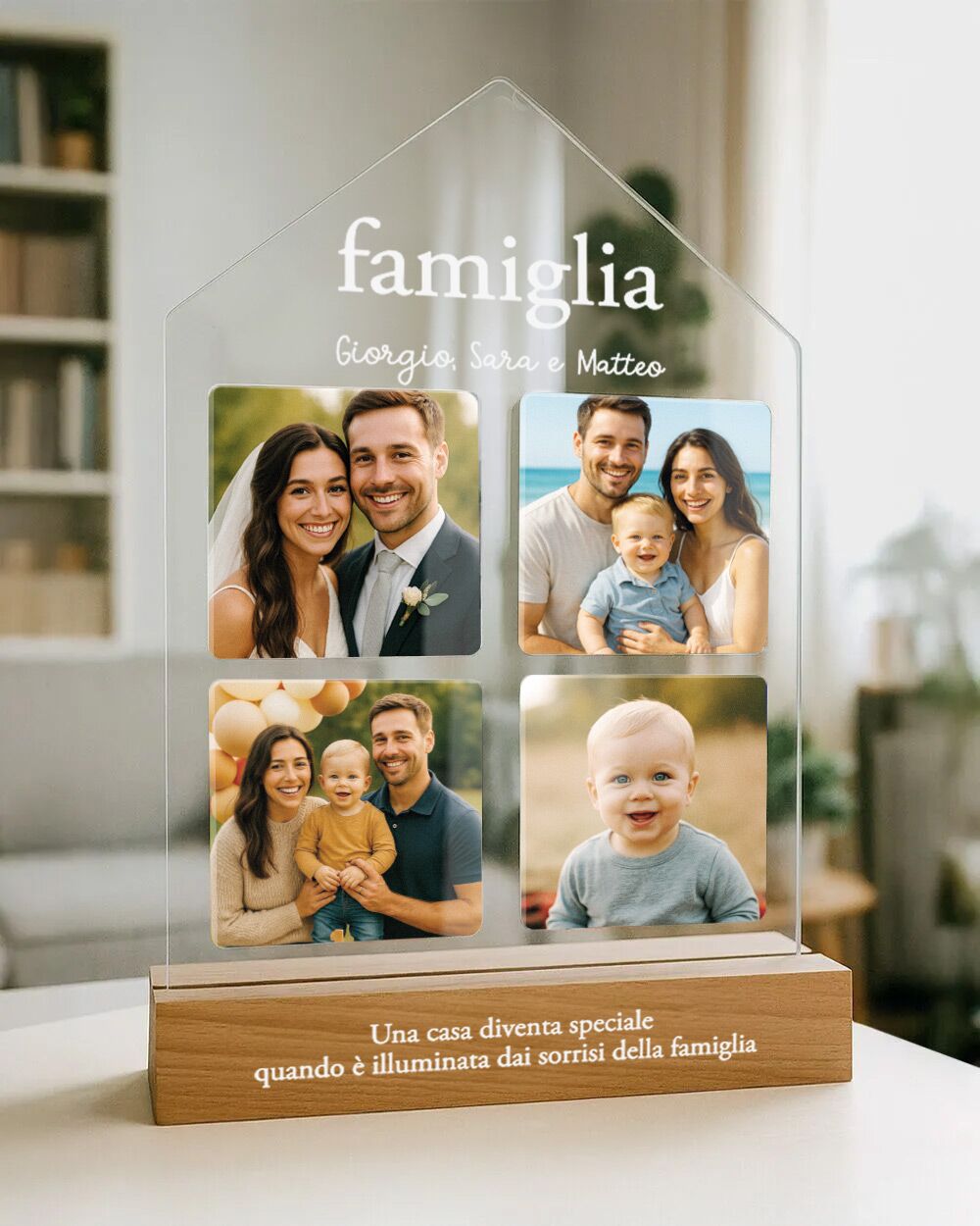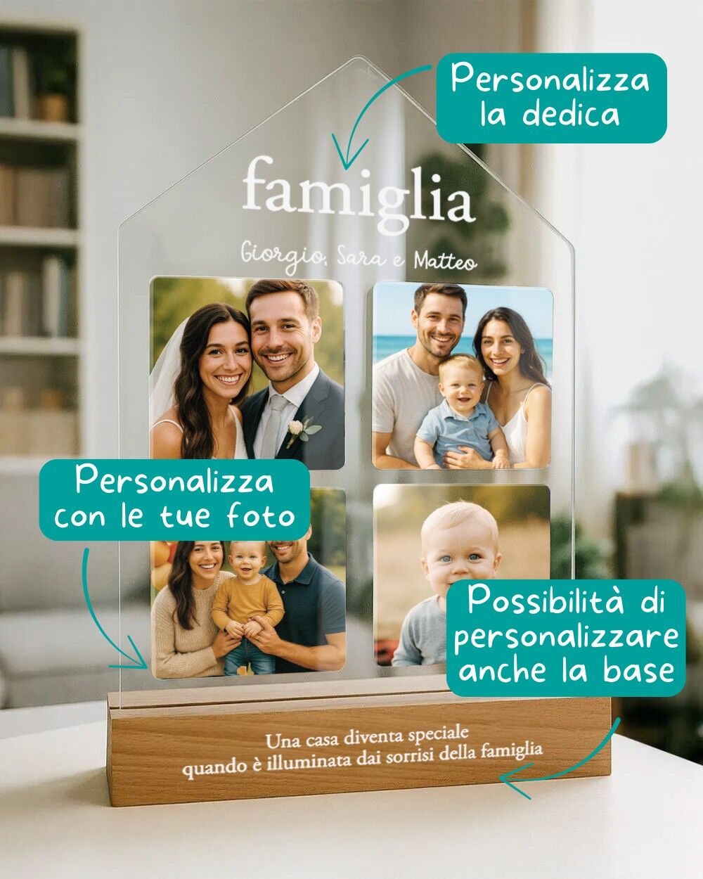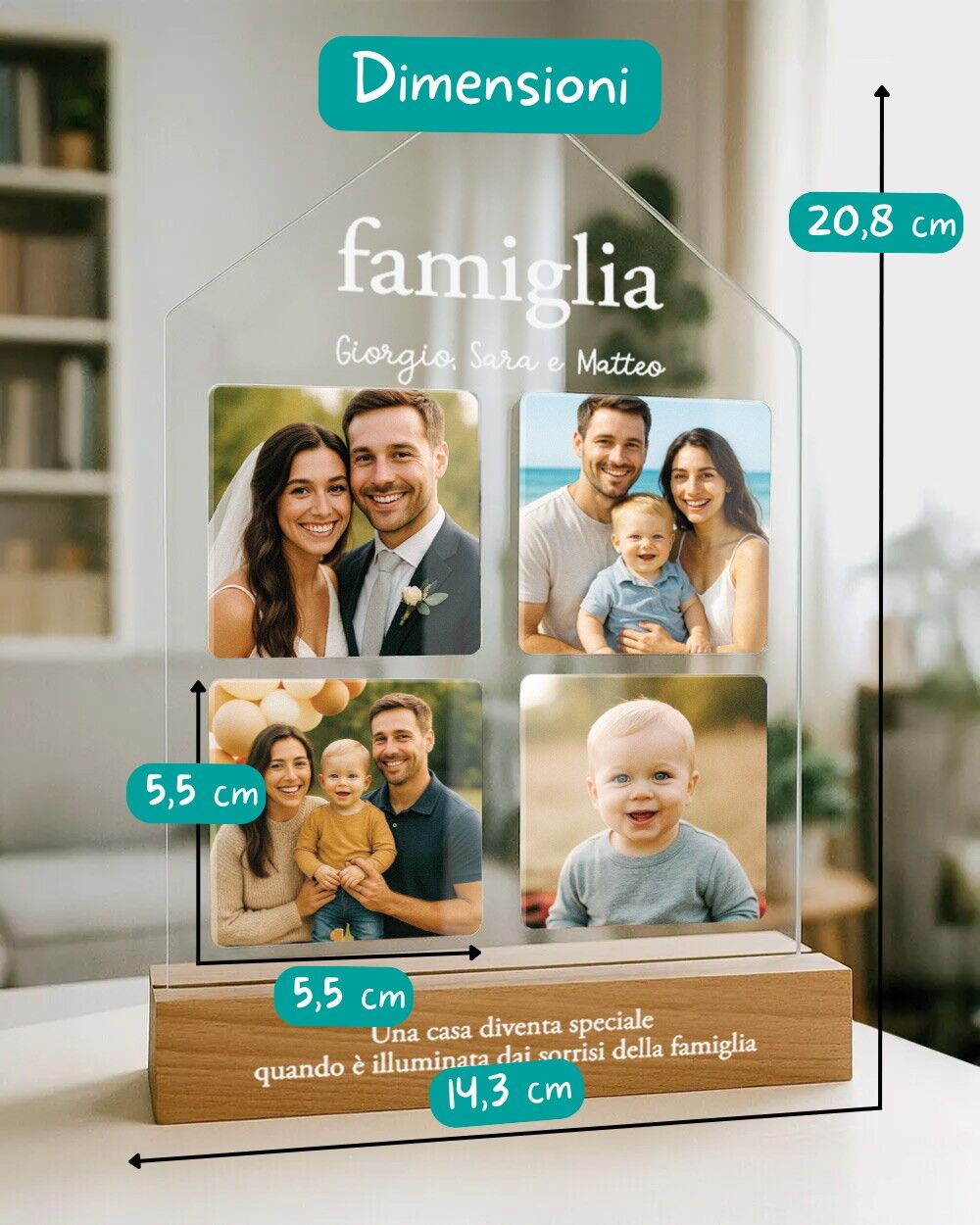 PERSONALIZZAZIONE: personalizza la targhetta con 4 foto interscambiabili e aggiungi una dedica. Se lo desideri, personalizza la base della targhetta con un’ulteriore dedica.