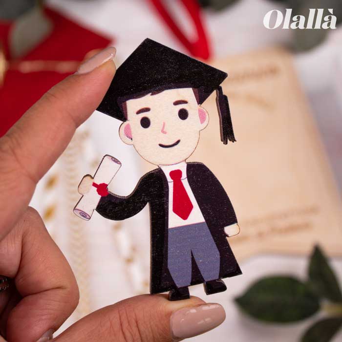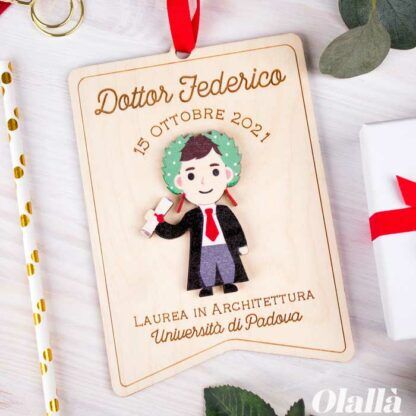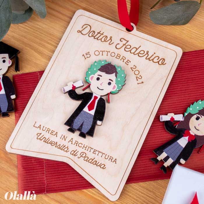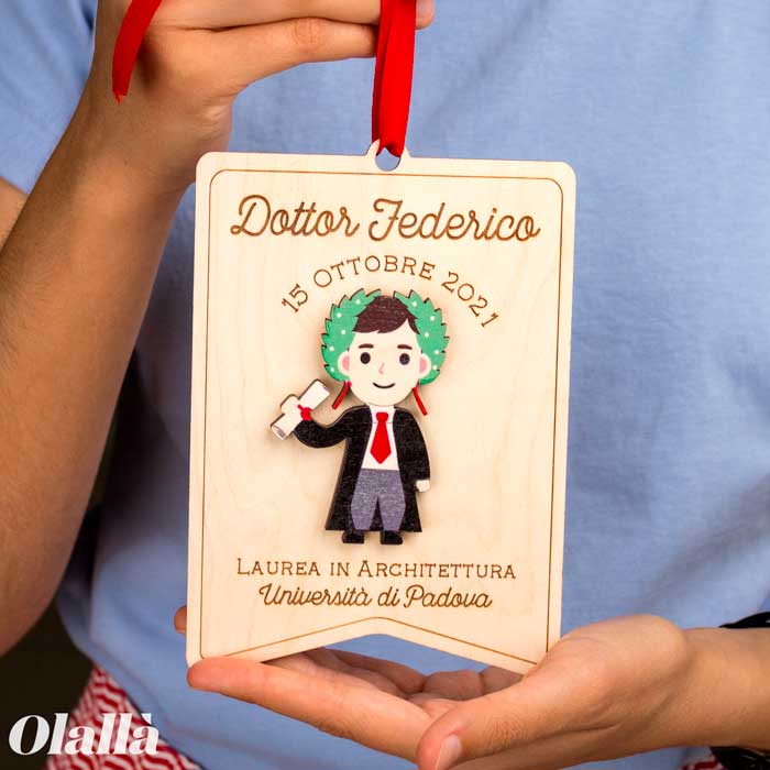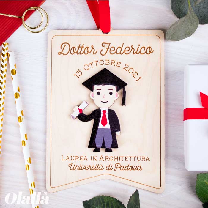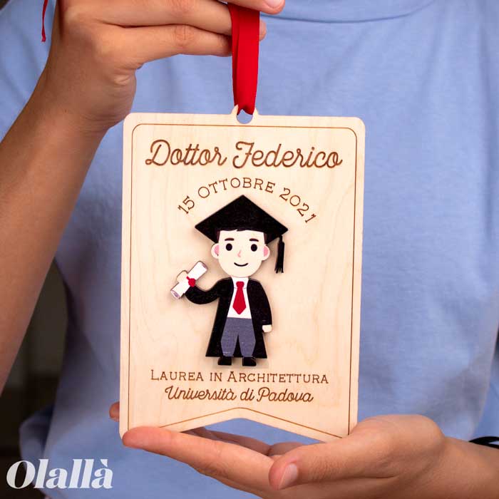 Simpatico stendardo in legno con ritratto del laureato. Personalizzalo con la riproduzione in legno del neo dottore, data e nome della facoltà. Infine, aggiungi un tocco extra speciale facendo incidere una dedica solo tua sul retro! Fai un regalo da conservare per sempre a chi ce l’ha messa davvero tutta per raggiungere questo ambito traguardo!