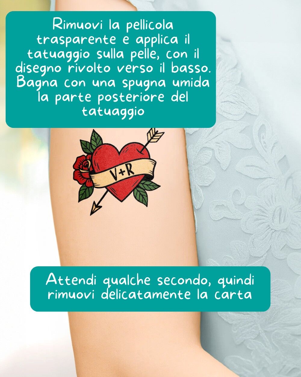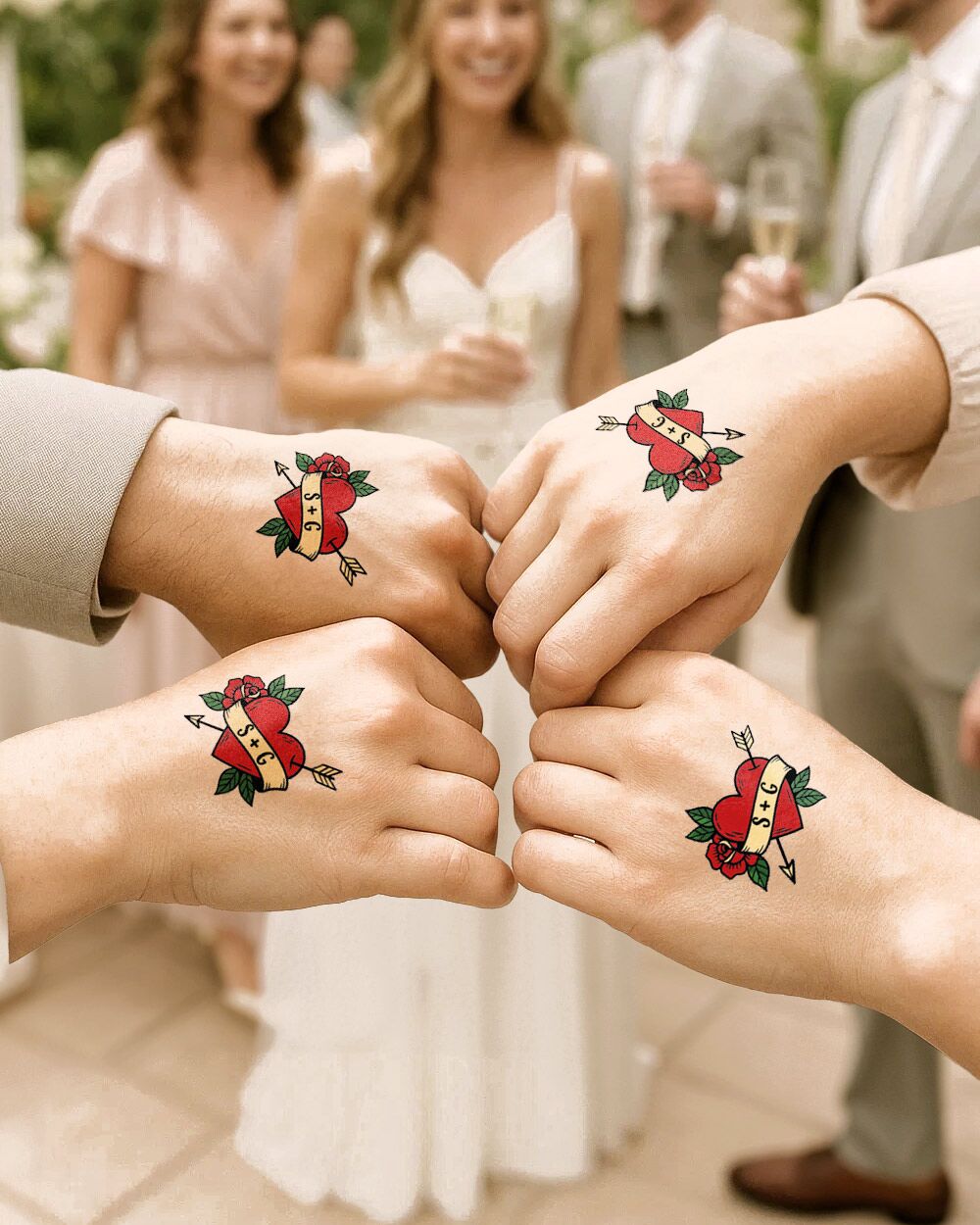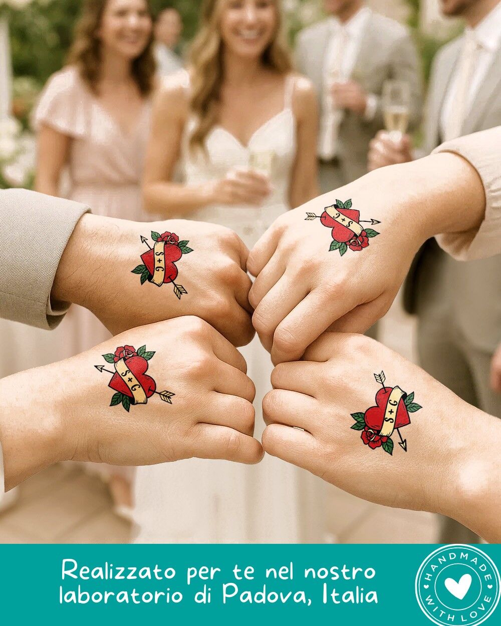 Se stai cercando un gadget unico per il tuo grande giorno, questo tatuaggio temporaneo matrimonio è la scelta giusta. È perfetto da regalare agli ospiti come ricordo originale, da indossare durante il party per selfie divertenti o da distribuire ai testimoni per creare un look coordinato e scherzoso.